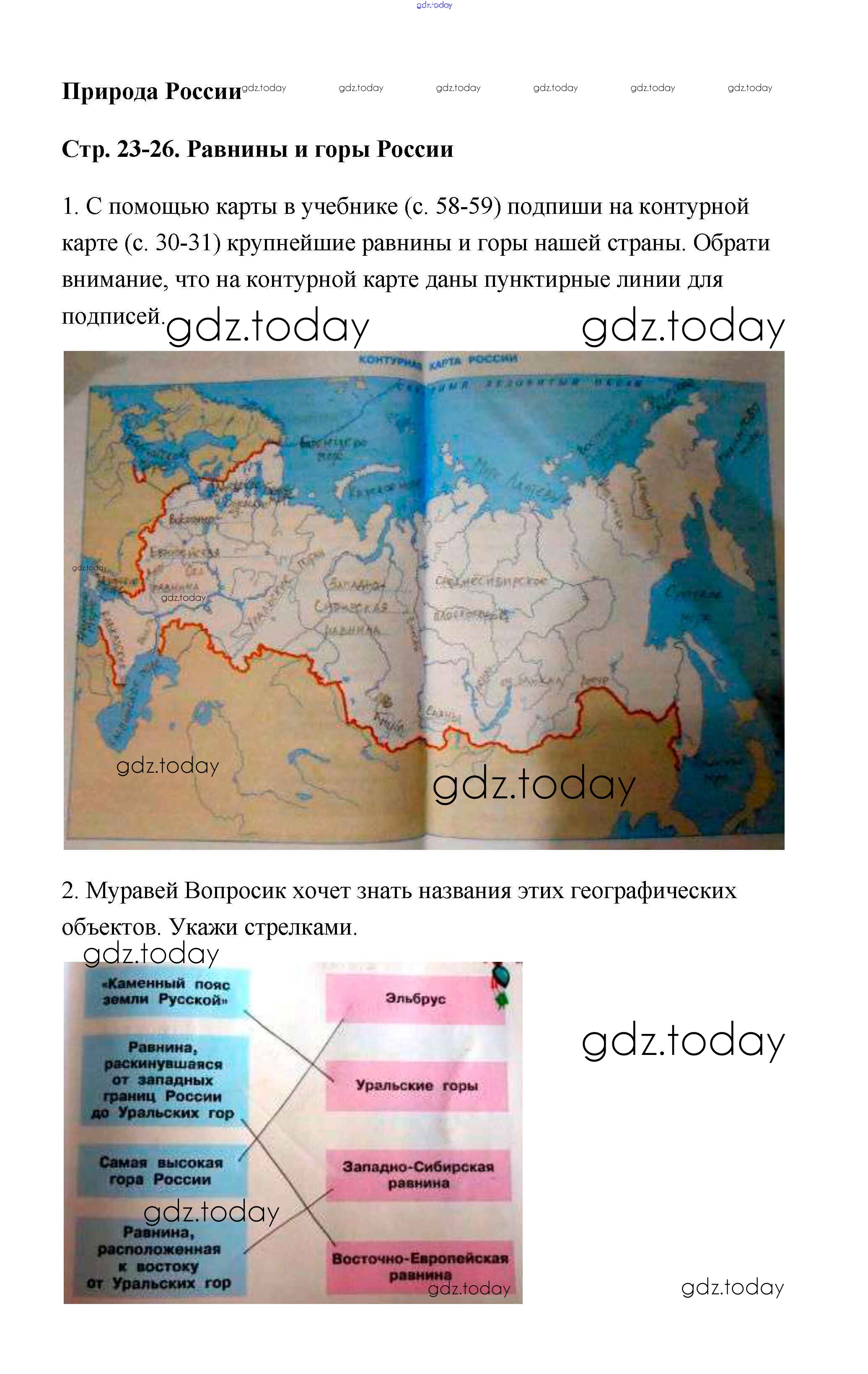 На страницах сайта gdz.today вы найдете учебный и вспомогательный материал, направленный на улучшения знаний школьной программы. ГДЗ - онлайн мир знаний Решение к части 1. Страницы 23 Рабочей тетради по Окружающему миру для 4 класса Плешаков, Крючкова Просвещение Школа России 2014
