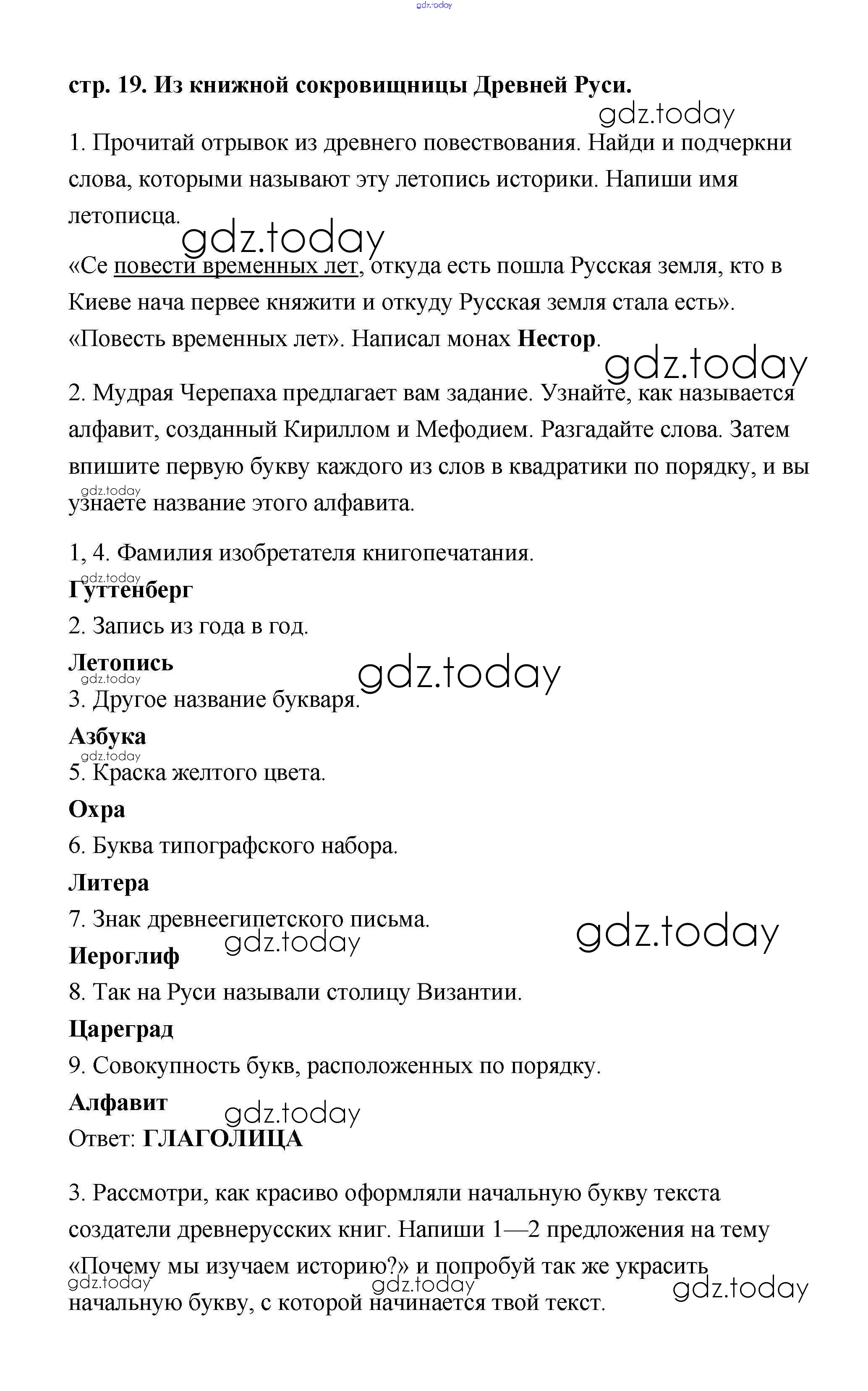 На страницах сайта gdz.today вы найдете учебный и вспомогательный материал, направленный на улучшения знаний школьной программы. ГДЗ - онлайн мир знаний Решение к части 2. Страницы 19 Рабочей тетради по Окружающему миру для 4 класса Плешаков, Крючкова Просвещение Школа России 2014