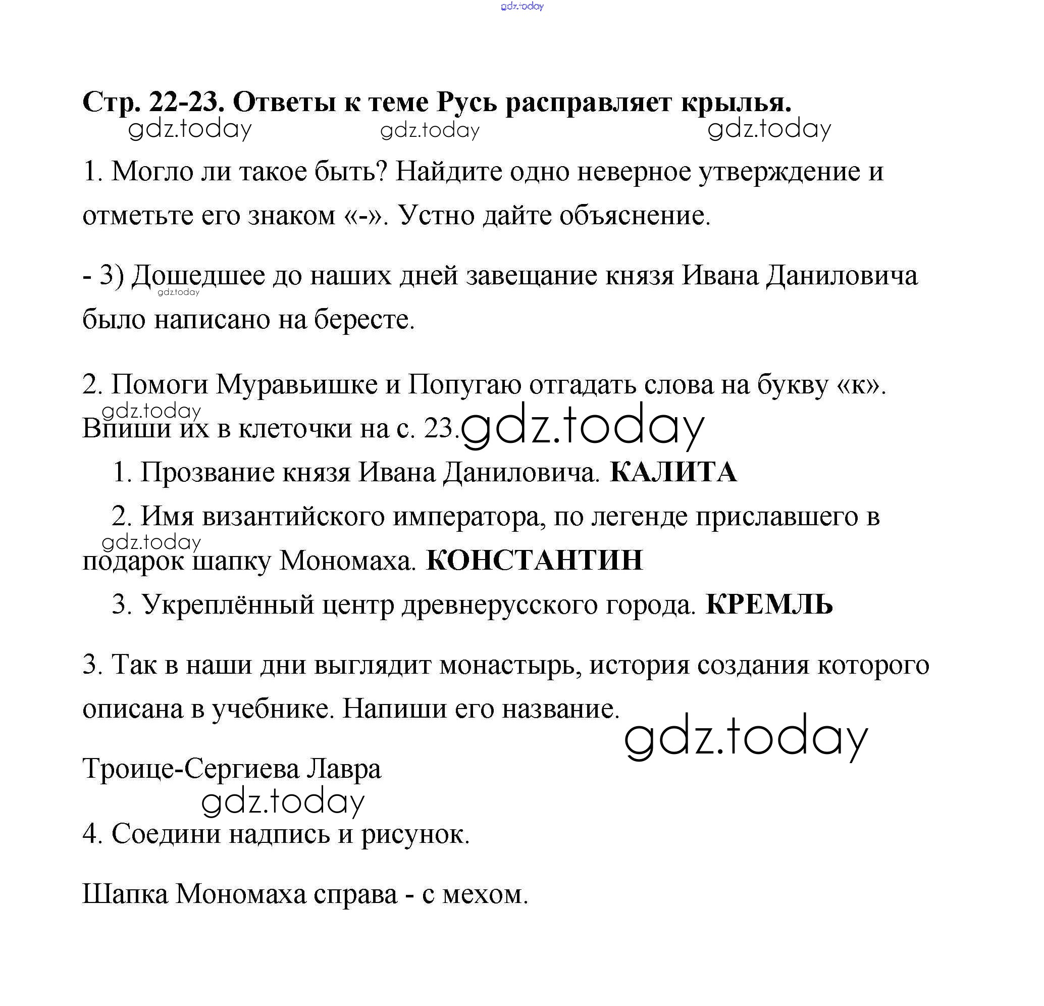 На страницах сайта gdz.today вы найдете учебный и вспомогательный материал, направленный на улучшения знаний школьной программы. ГДЗ - онлайн мир знаний Решение к части 2. Страницы 22 Рабочей тетради по Окружающему миру для 4 класса Плешаков, Крючкова Просвещение Школа России 2014