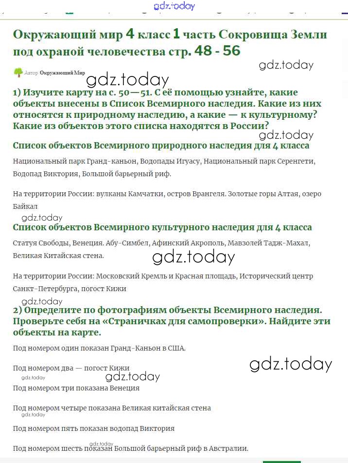 На страницах сайта gdz.today вы найдете учебный и вспомогательный материал, направленный на улучшения знаний школьной программы. ГДЗ - онлайн мир знаний Земля и человечество Решение к части 1 48 Учебнику по Окружающему миру для 4 класса Плешаков, Крючкова Просвещение Школа России 2013
