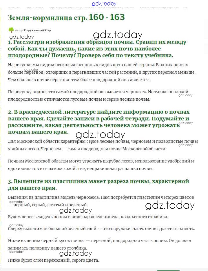 На страницах сайта gdz.today вы найдете учебный и вспомогательный материал, направленный на улучшения знаний школьной программы. ГДЗ - онлайн мир знаний Родной край - часть большой страны Решение к части 1 160 Учебнику по Окружающему миру для 4 класса Плешаков, Крючкова Просвещение Школа России 2013