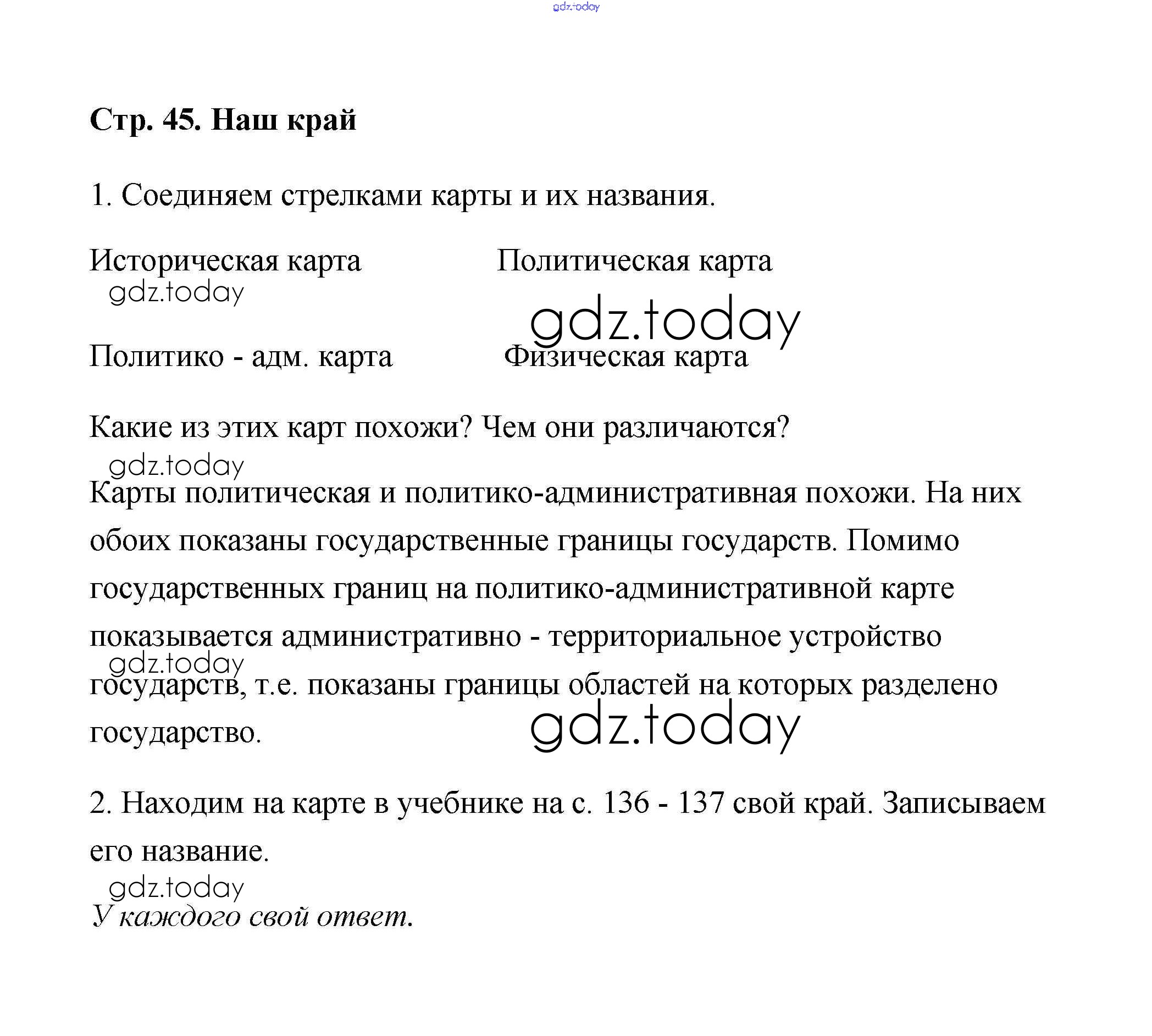 На страницах сайта gdz.today вы найдете учебный и вспомогательный материал, направленный на улучшения знаний школьной программы. ГДЗ - онлайн мир знаний Решение к части 1 45 Тетради для практических работ по Окружающему миру для 4 класса Тихомирова Экзамен 2017