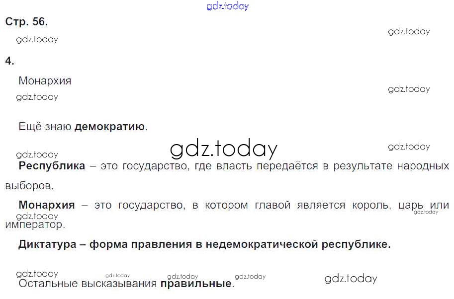 На страницах сайта gdz.today вы найдете учебный и вспомогательный материал, направленный на улучшения знаний школьной программы. ГДЗ - онлайн мир знаний Решение к части 1. Страницы 56 Рабочей тетради по Окружающему миру для 4 класса Вахрушев, Бурский Баласс Школа 2100 2016