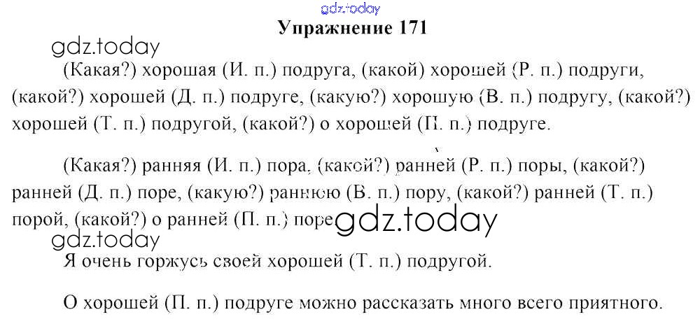 На страницах сайта gdz.today вы найдете учебный и вспомогательный материал, направленный на улучшения знаний школьной программы. ГДЗ - онлайн мир знаний Часть 1. Решение к заданиям 171 Учебнику по Русскому языку для 4 класса Антипова, Верниковская Национальный институт образования 2018