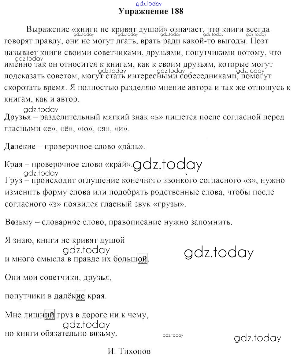 На страницах сайта gdz.today вы найдете учебный и вспомогательный материал, направленный на улучшения знаний школьной программы. ГДЗ - онлайн мир знаний Часть 1. Решение к заданиям 188 Учебнику по Русскому языку для 4 класса Антипова, Верниковская Национальный институт образования 2018