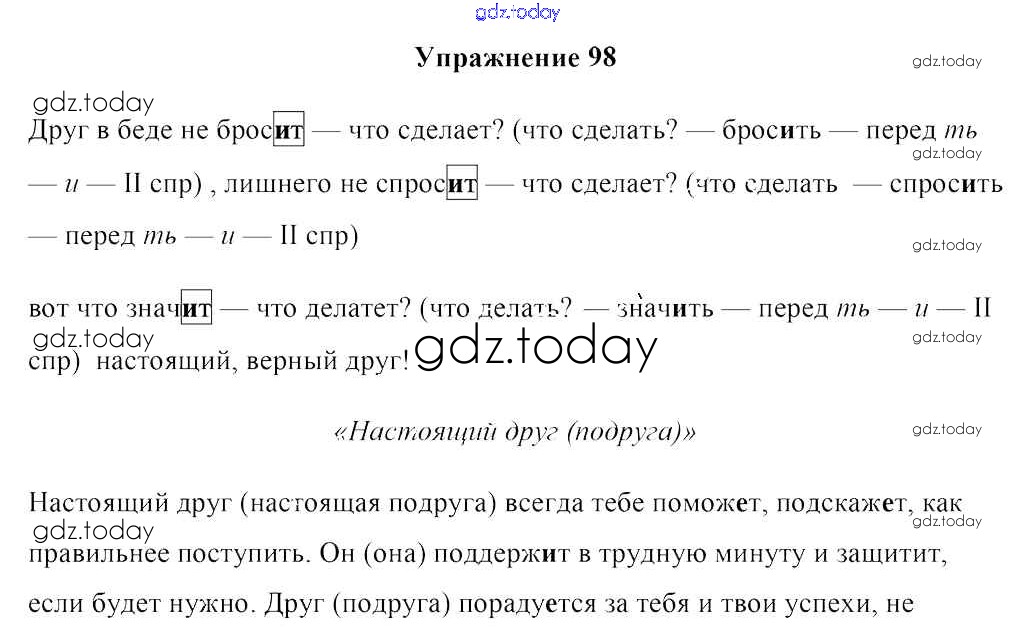 На страницах сайта gdz.today вы найдете учебный и вспомогательный материал, направленный на улучшения знаний школьной программы. ГДЗ - онлайн мир знаний Часть 2. Решение к заданиям 98 Учебнику по Русскому языку для 4 класса Антипова, Верниковская Национальный институт образования 2018