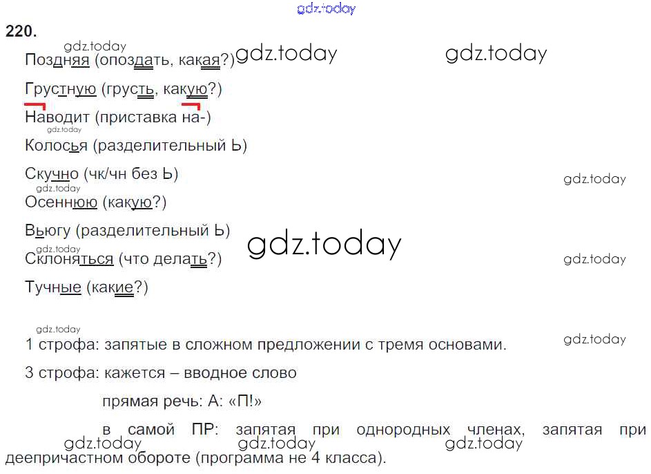 На страницах сайта gdz.today вы найдете учебный и вспомогательный материал, направленный на улучшения знаний школьной программы. ГДЗ - онлайн мир знаний Решение к упражнениям 220 Учебнику по Русскому языку для 4 класса Бунеев, Бунеева Баласс Школа 2100 2016