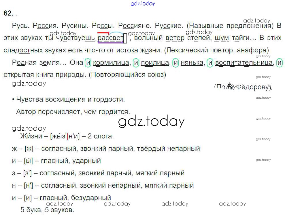 Ответы к Решение к упражнениям 62 Учебнику по Русскому языку для 4 класса Бунеев, Бунеева Баласс Школа 2100 2016