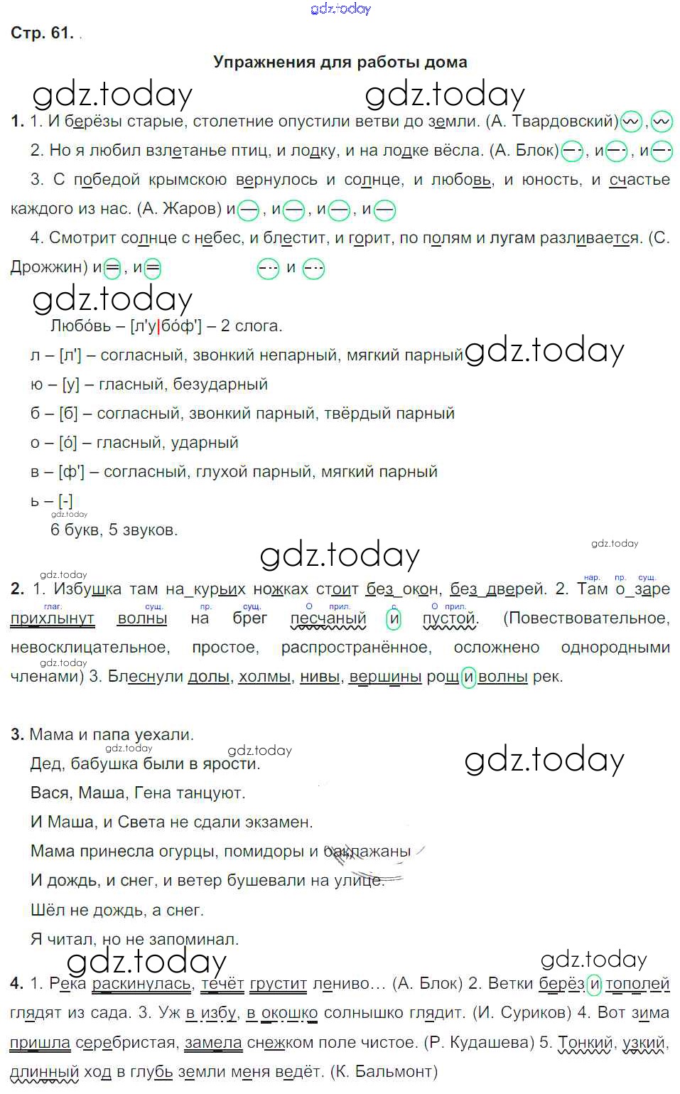 Ответы к Часть 1. Страницы Решение к домашним упражнениям 61 Учебнику по Русскому языку для 4 класса Бунеев, Бунеева Баласс Школа 2100 2016