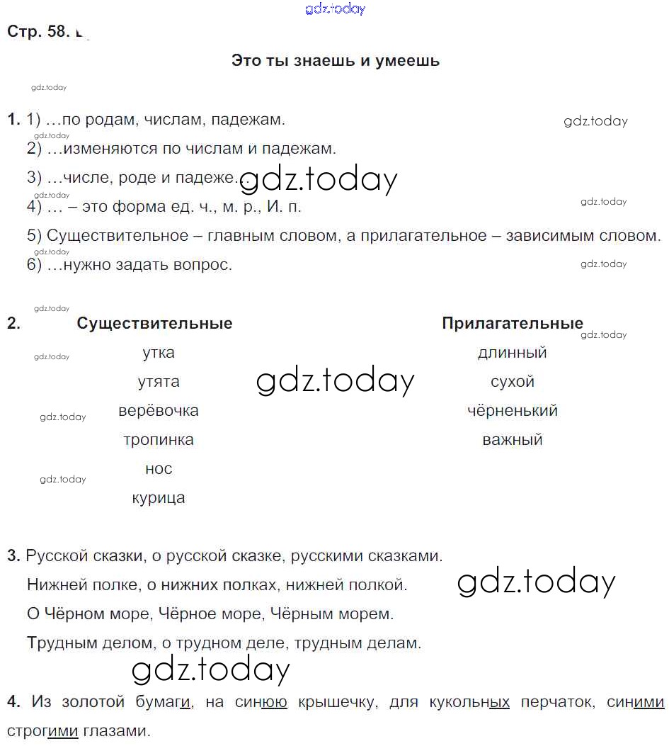 Ответы к Часть 2. Страницы Знаем и умеем 58 Учебнику по Русскому языку для 4 класса Бунеев, Бунеева Баласс Школа 2100 2016