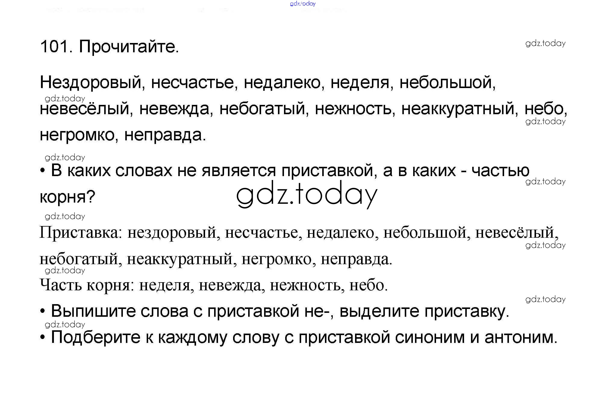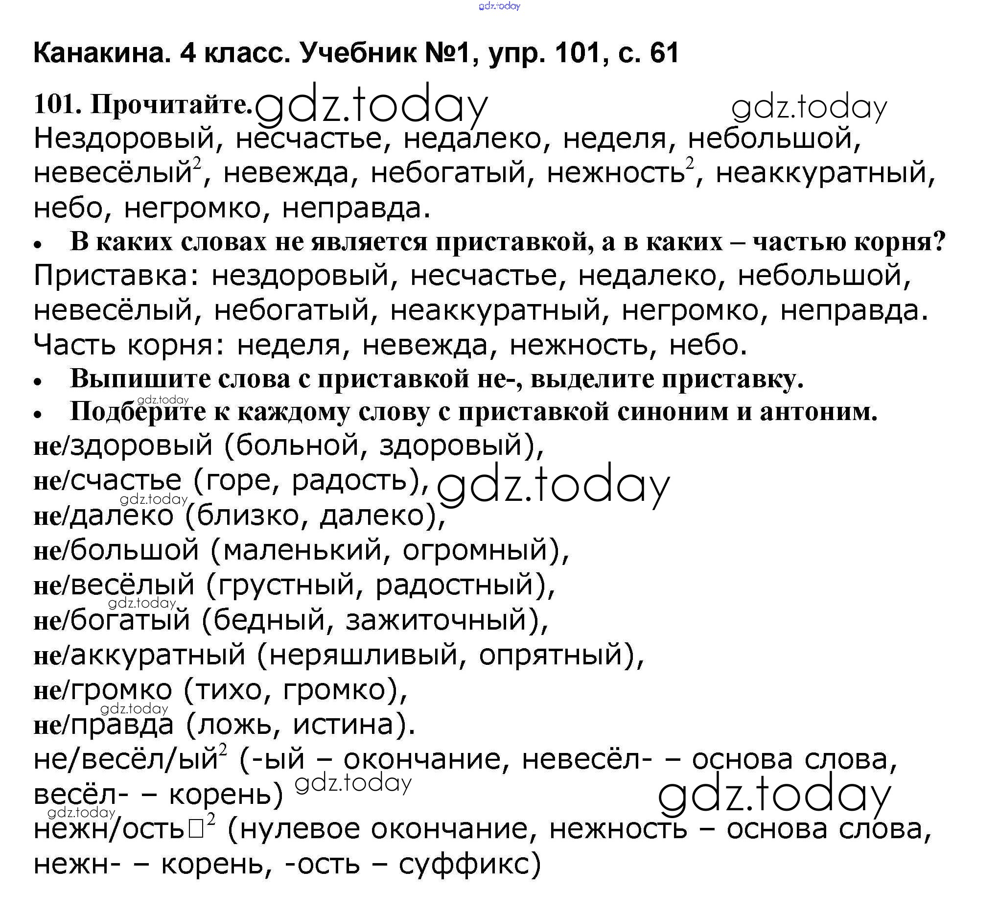 На страницах сайта gdz.today вы найдете учебный и вспомогательный материал, направленный на улучшения знаний школьной программы. ГДЗ - онлайн мир знаний Решение к части 1 101 Учебнику по Русскому языку для 4 класса Канакина, Горецкий Просвещение Школа России 2015