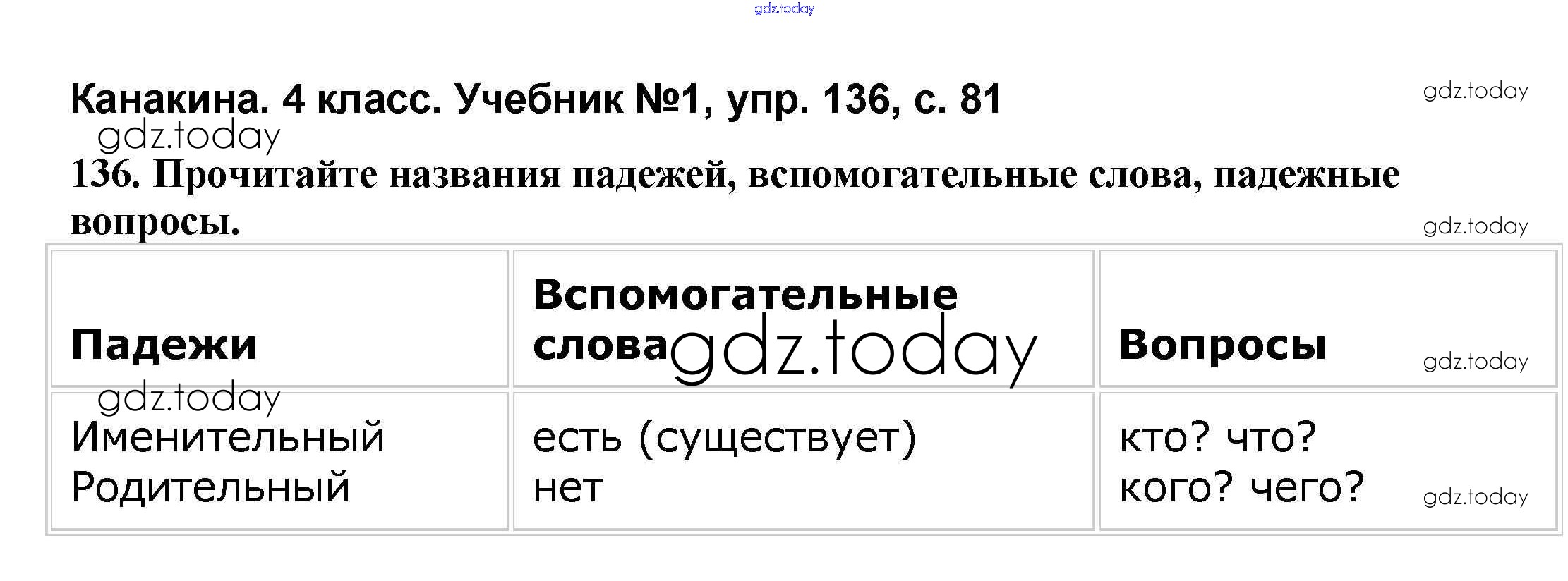 На страницах сайта gdz.today вы найдете учебный и вспомогательный материал, направленный на улучшения знаний школьной программы. ГДЗ - онлайн мир знаний Решение к части 1 136 Учебнику по Русскому языку для 4 класса Канакина, Горецкий Просвещение Школа России 2015