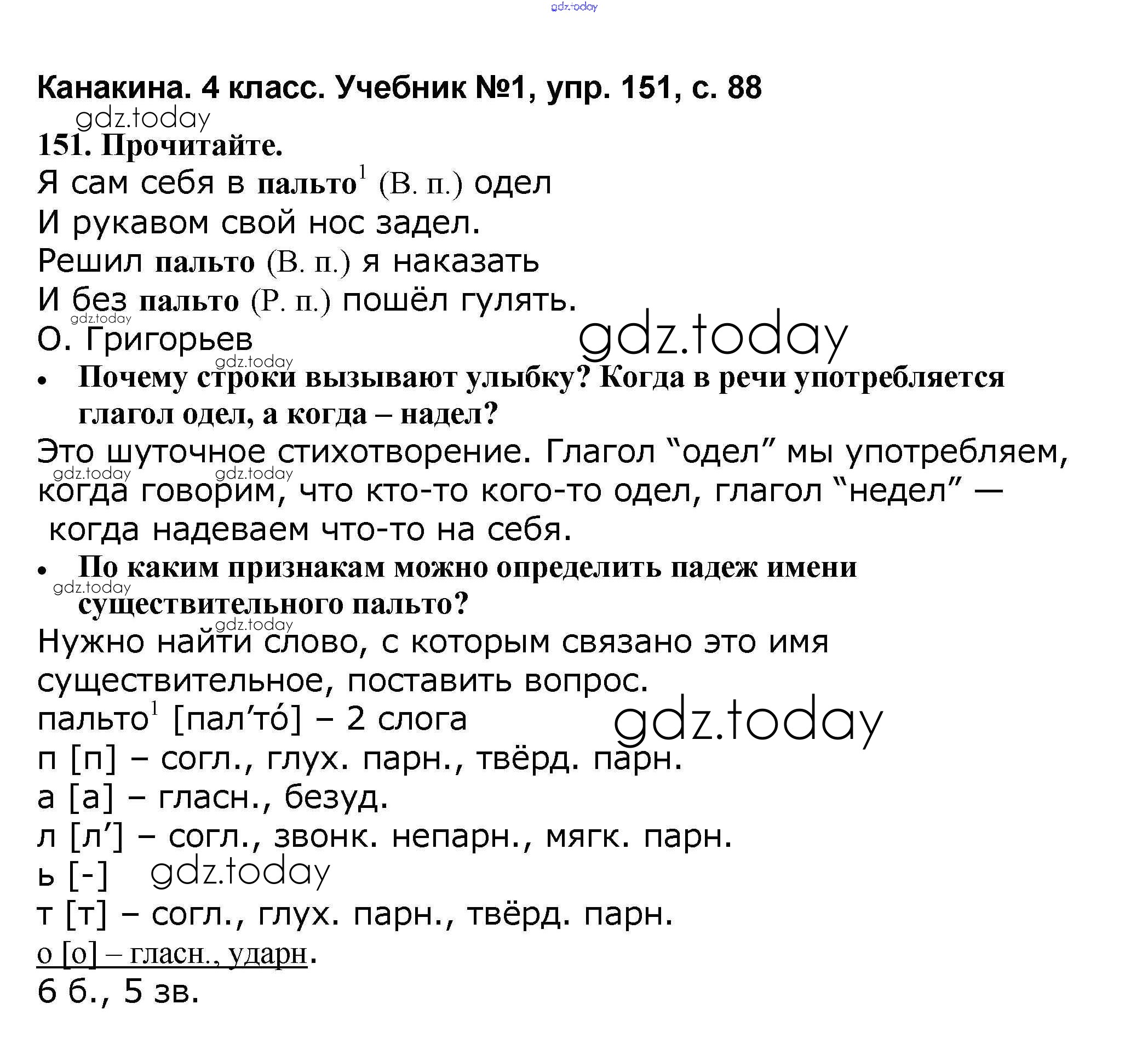 На страницах сайта gdz.today вы найдете учебный и вспомогательный материал, направленный на улучшения знаний школьной программы. ГДЗ - онлайн мир знаний Решение к части 1 151 Учебнику по Русскому языку для 4 класса Канакина, Горецкий Просвещение Школа России 2015