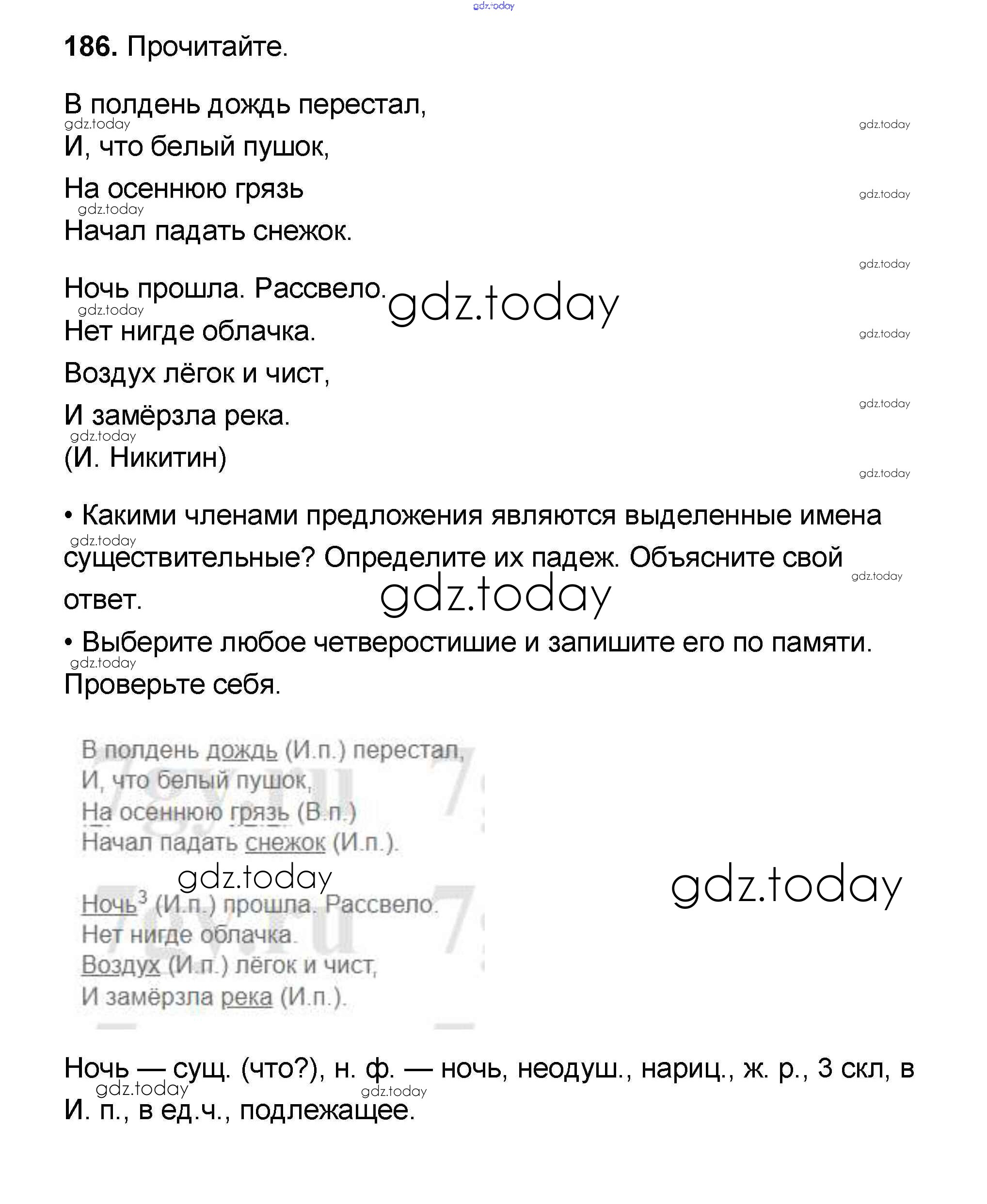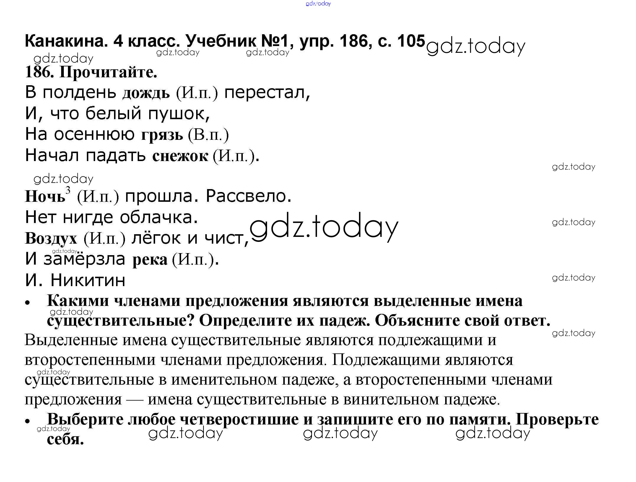 На страницах сайта gdz.today вы найдете учебный и вспомогательный материал, направленный на улучшения знаний школьной программы. ГДЗ - онлайн мир знаний Решение к части 1 186 Учебнику по Русскому языку для 4 класса Канакина, Горецкий Просвещение Школа России 2015