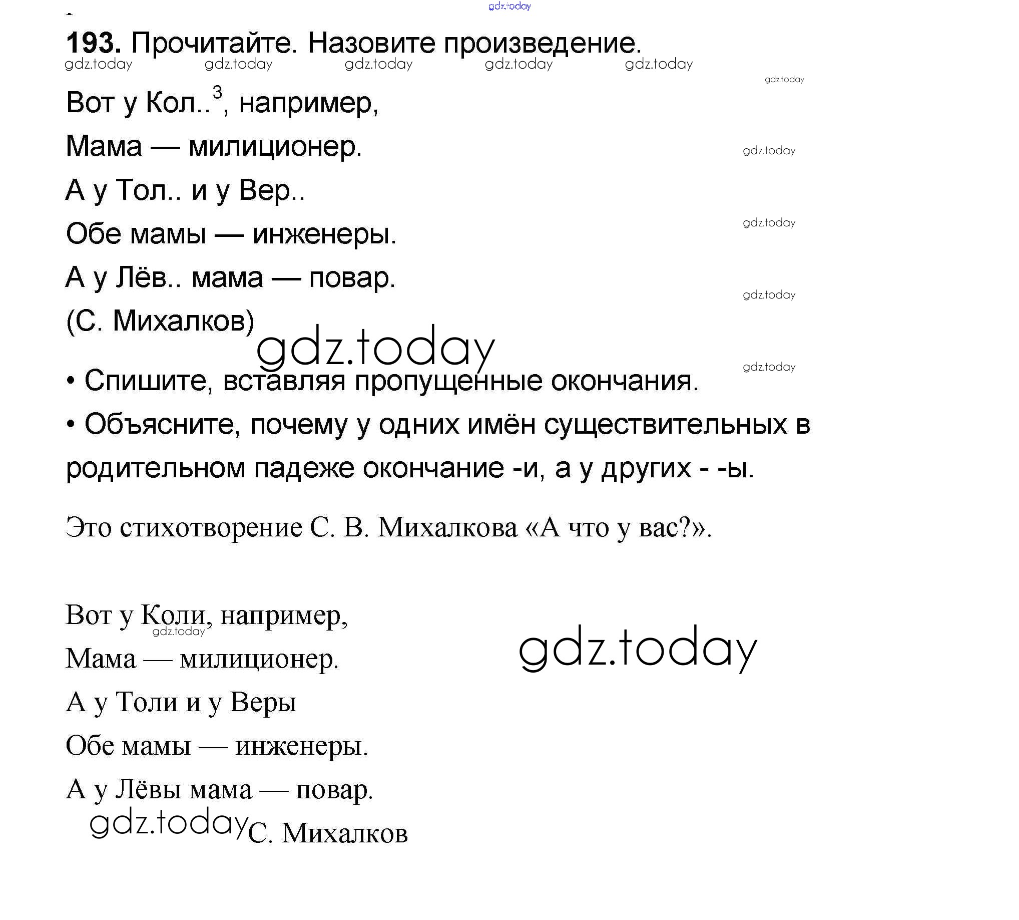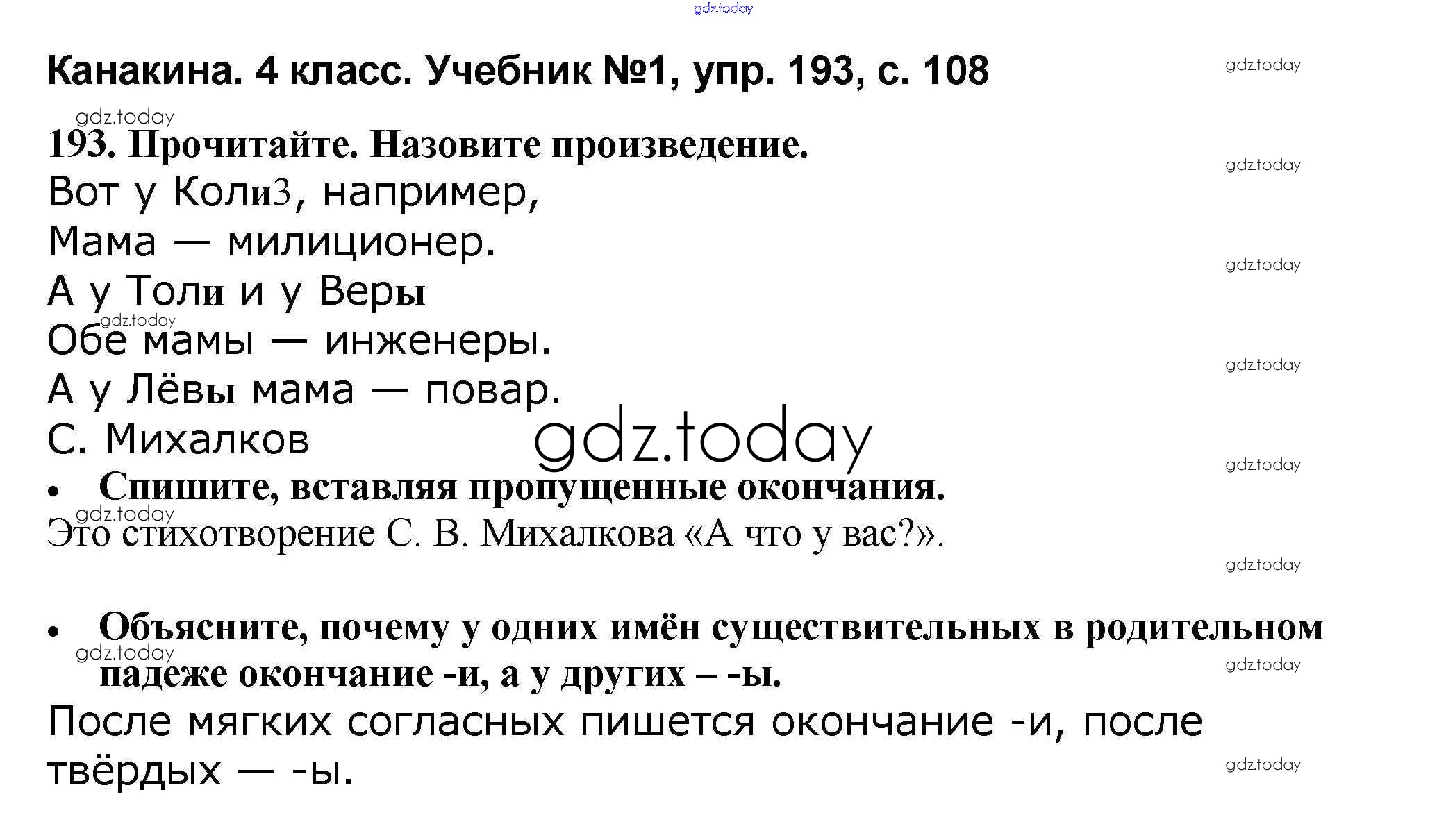 На страницах сайта gdz.today вы найдете учебный и вспомогательный материал, направленный на улучшения знаний школьной программы. ГДЗ - онлайн мир знаний Решение к части 1 193 Учебнику по Русскому языку для 4 класса Канакина, Горецкий Просвещение Школа России 2015