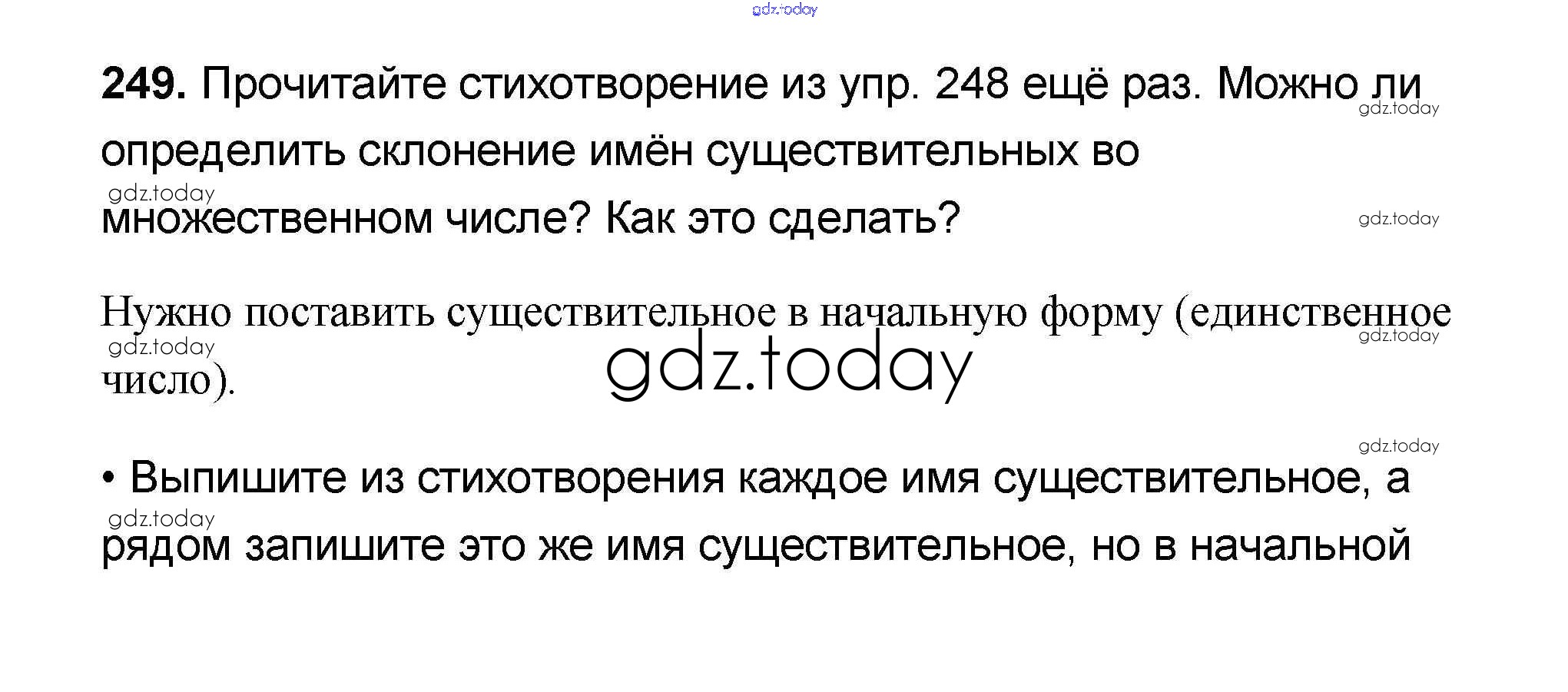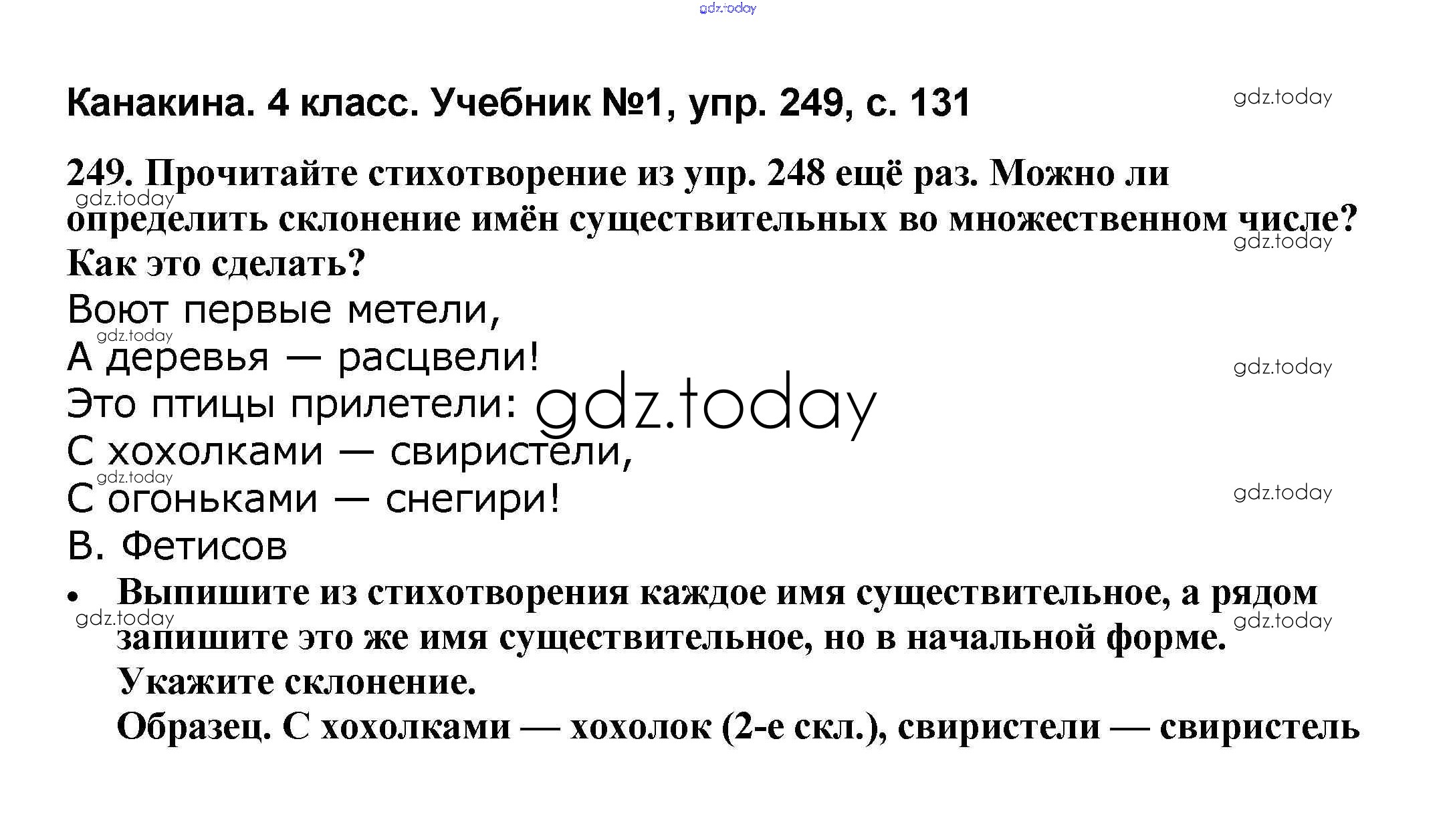 На страницах сайта gdz.today вы найдете учебный и вспомогательный материал, направленный на улучшения знаний школьной программы. ГДЗ - онлайн мир знаний Решение к части 1 249 Учебнику по Русскому языку для 4 класса Канакина, Горецкий Просвещение Школа России 2015