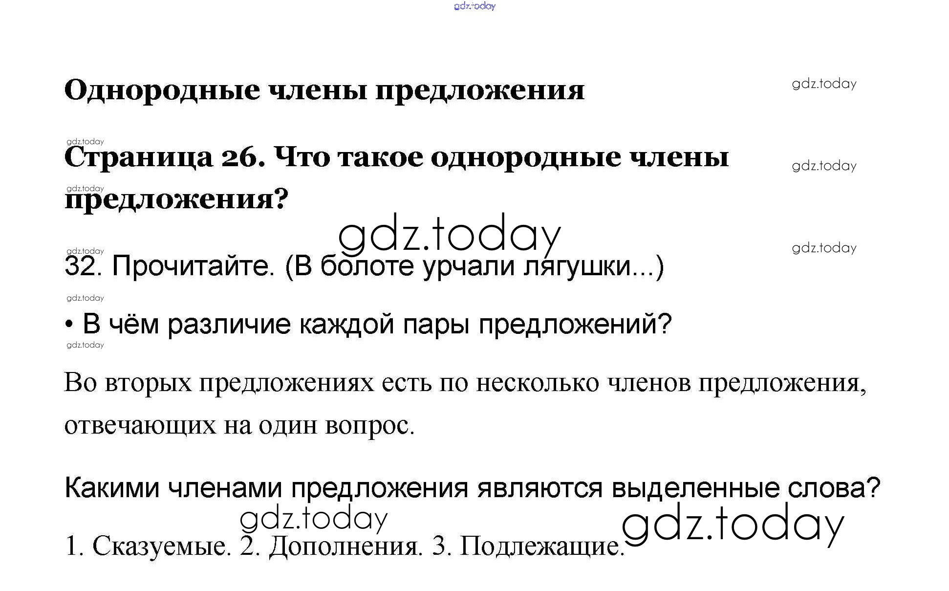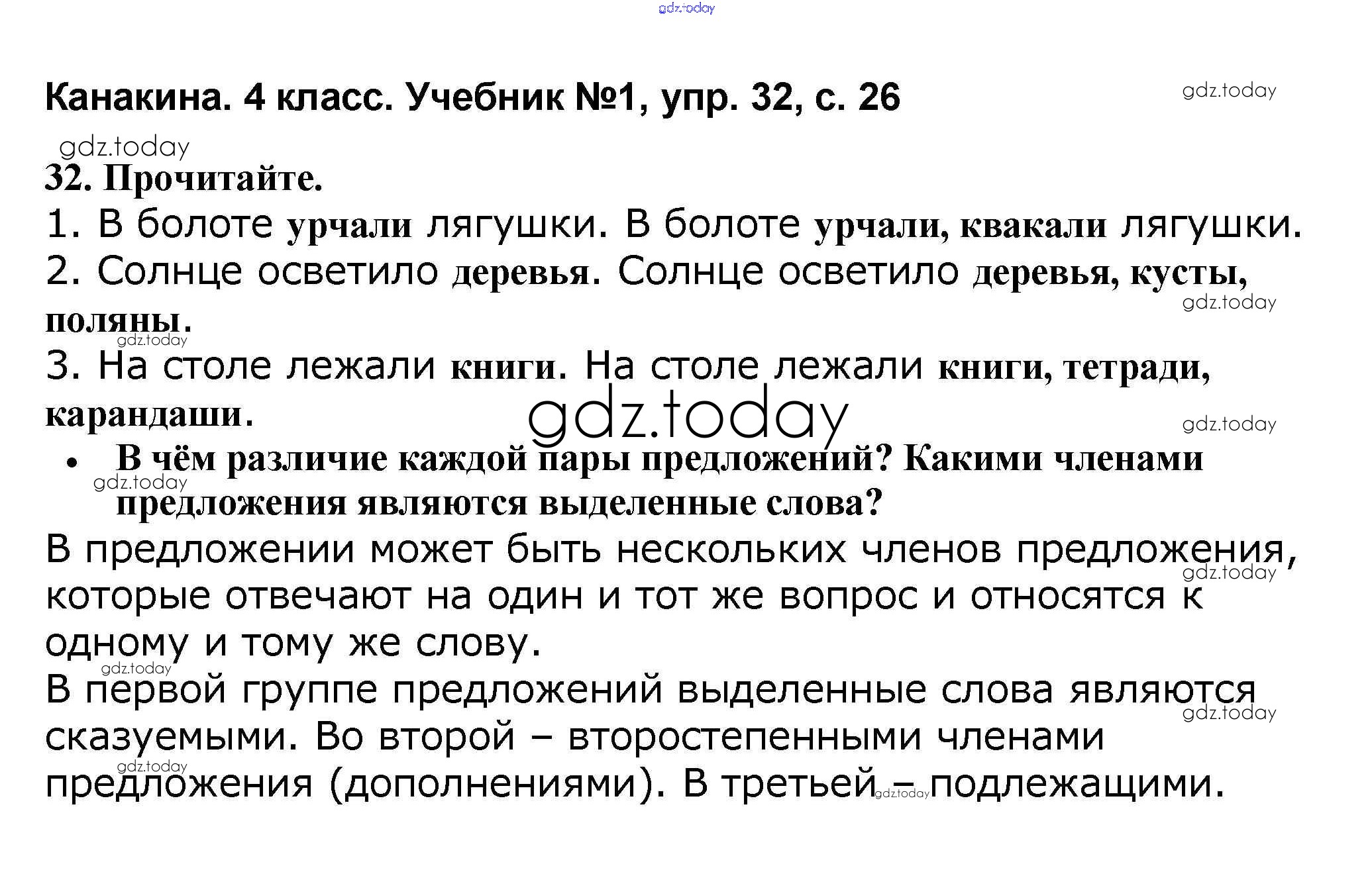На страницах сайта gdz.today вы найдете учебный и вспомогательный материал, направленный на улучшения знаний школьной программы. ГДЗ - онлайн мир знаний Решение к части 1 32 Учебнику по Русскому языку для 4 класса Канакина, Горецкий Просвещение Школа России 2015