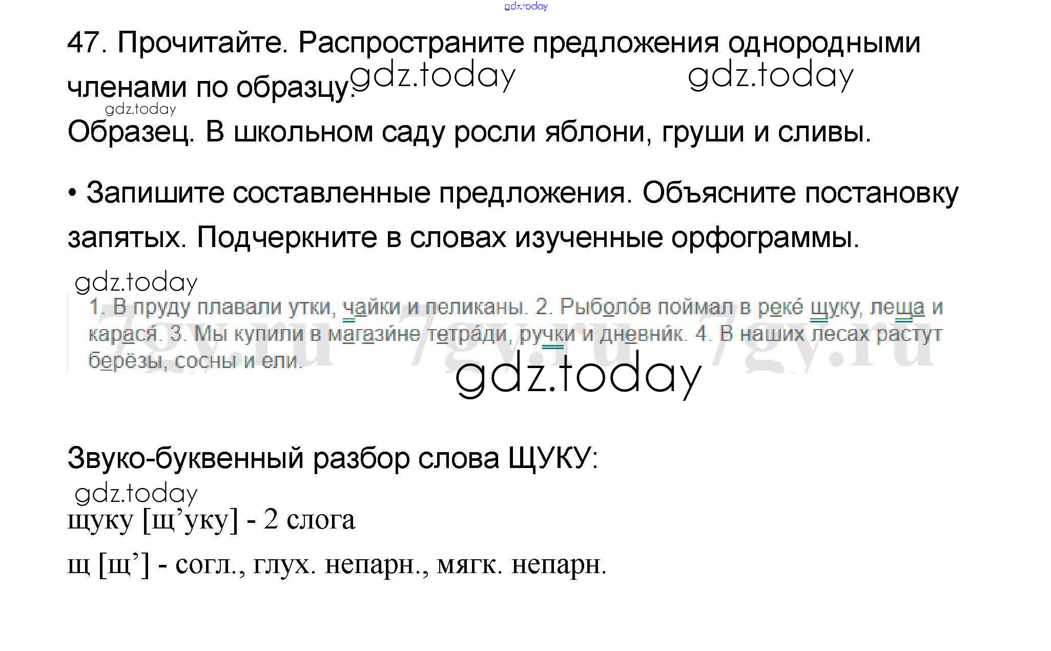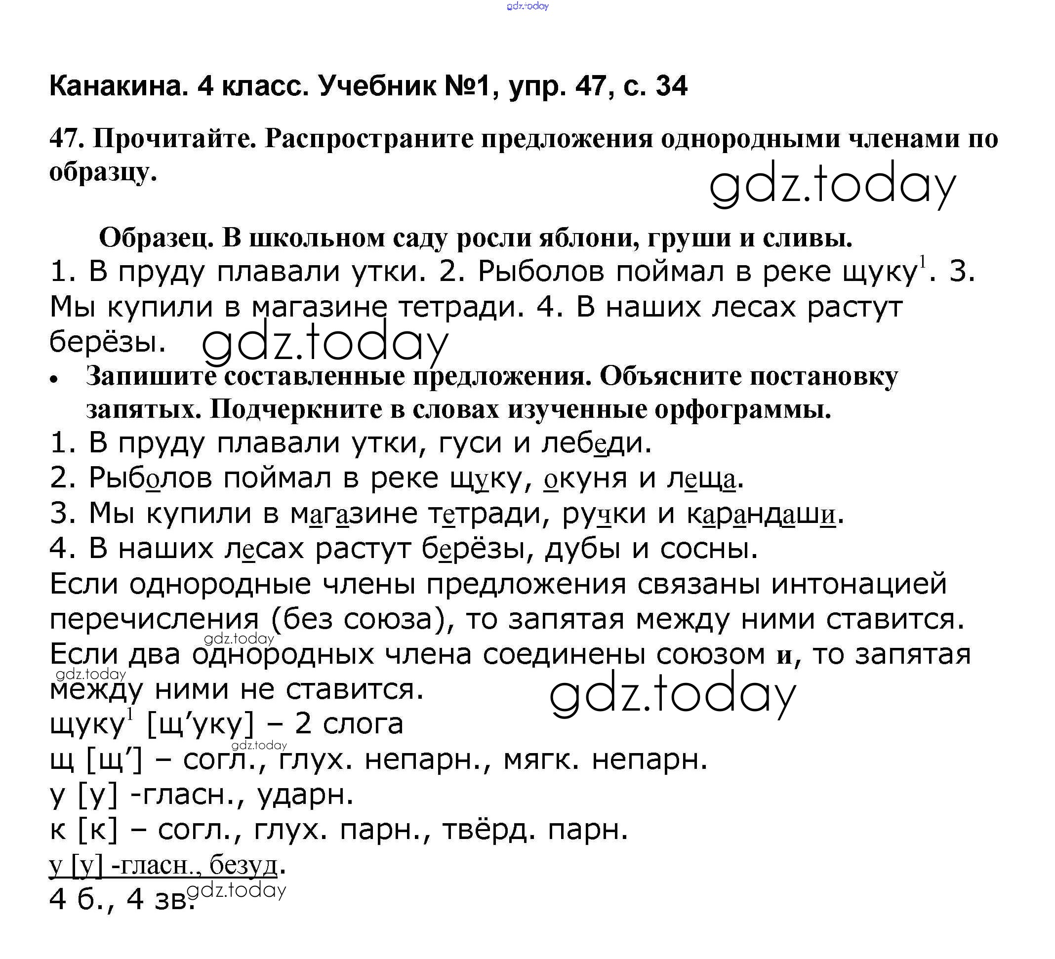 На страницах сайта gdz.today вы найдете учебный и вспомогательный материал, направленный на улучшения знаний школьной программы. ГДЗ - онлайн мир знаний Решение к части 1 47 Учебнику по Русскому языку для 4 класса Канакина, Горецкий Просвещение Школа России 2015