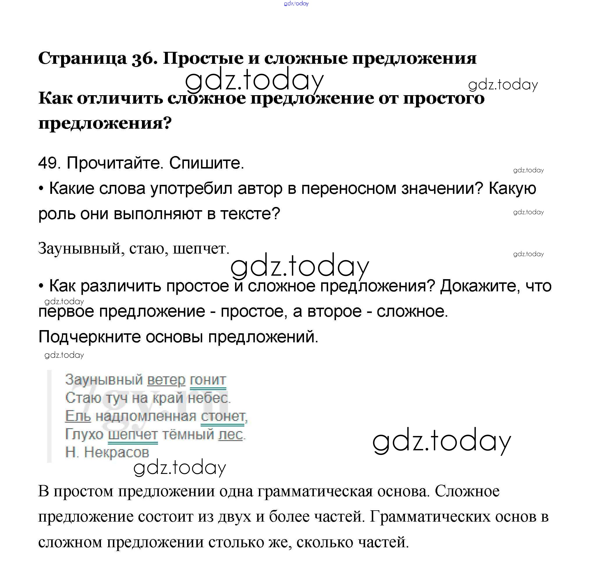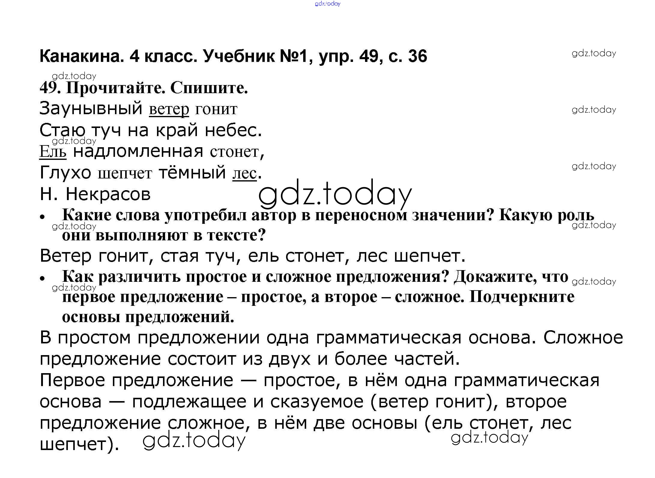 На страницах сайта gdz.today вы найдете учебный и вспомогательный материал, направленный на улучшения знаний школьной программы. ГДЗ - онлайн мир знаний Решение к части 1 49 Учебнику по Русскому языку для 4 класса Канакина, Горецкий Просвещение Школа России 2015