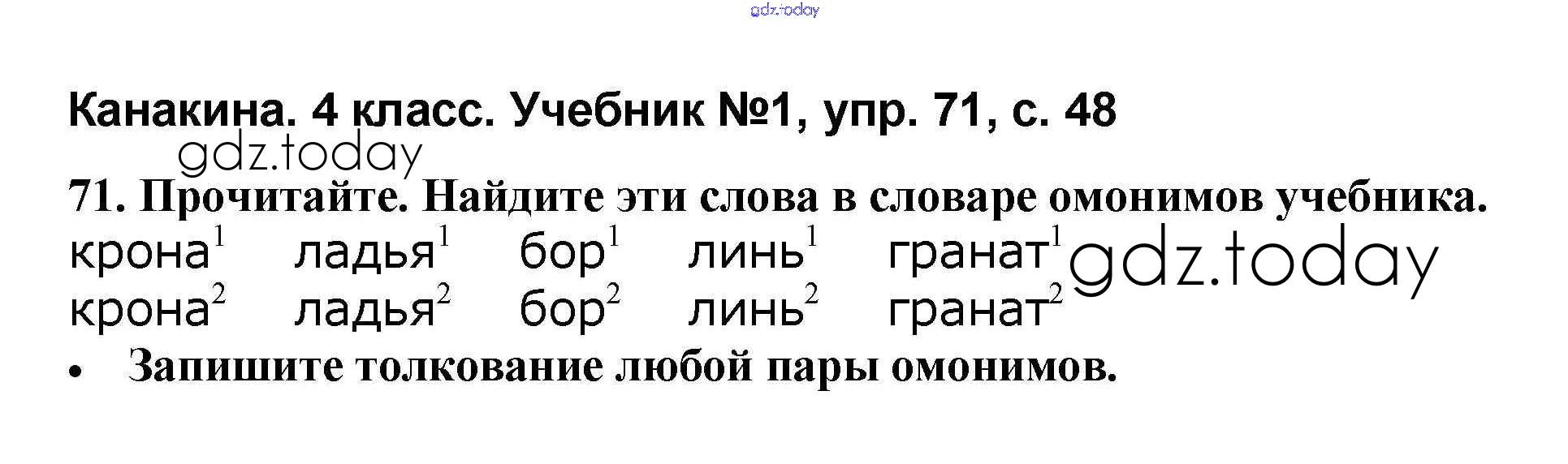 На страницах сайта gdz.today вы найдете учебный и вспомогательный материал, направленный на улучшения знаний школьной программы. ГДЗ - онлайн мир знаний Решение к части 1 71 Учебнику по Русскому языку для 4 класса Канакина, Горецкий Просвещение Школа России 2015
