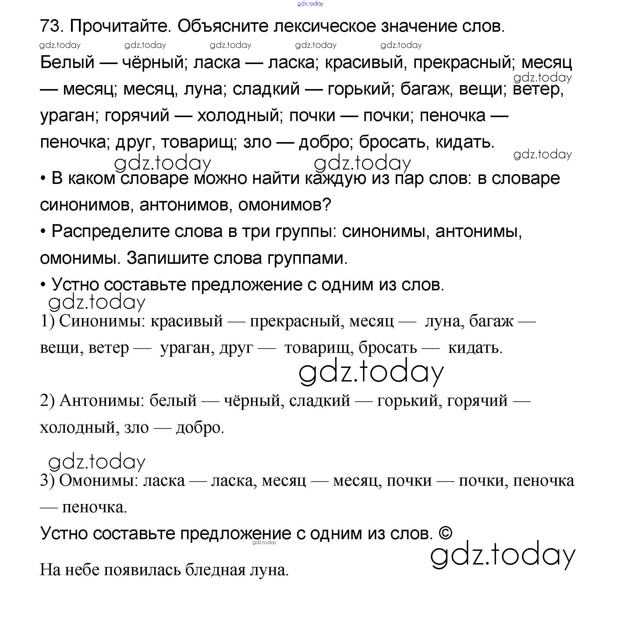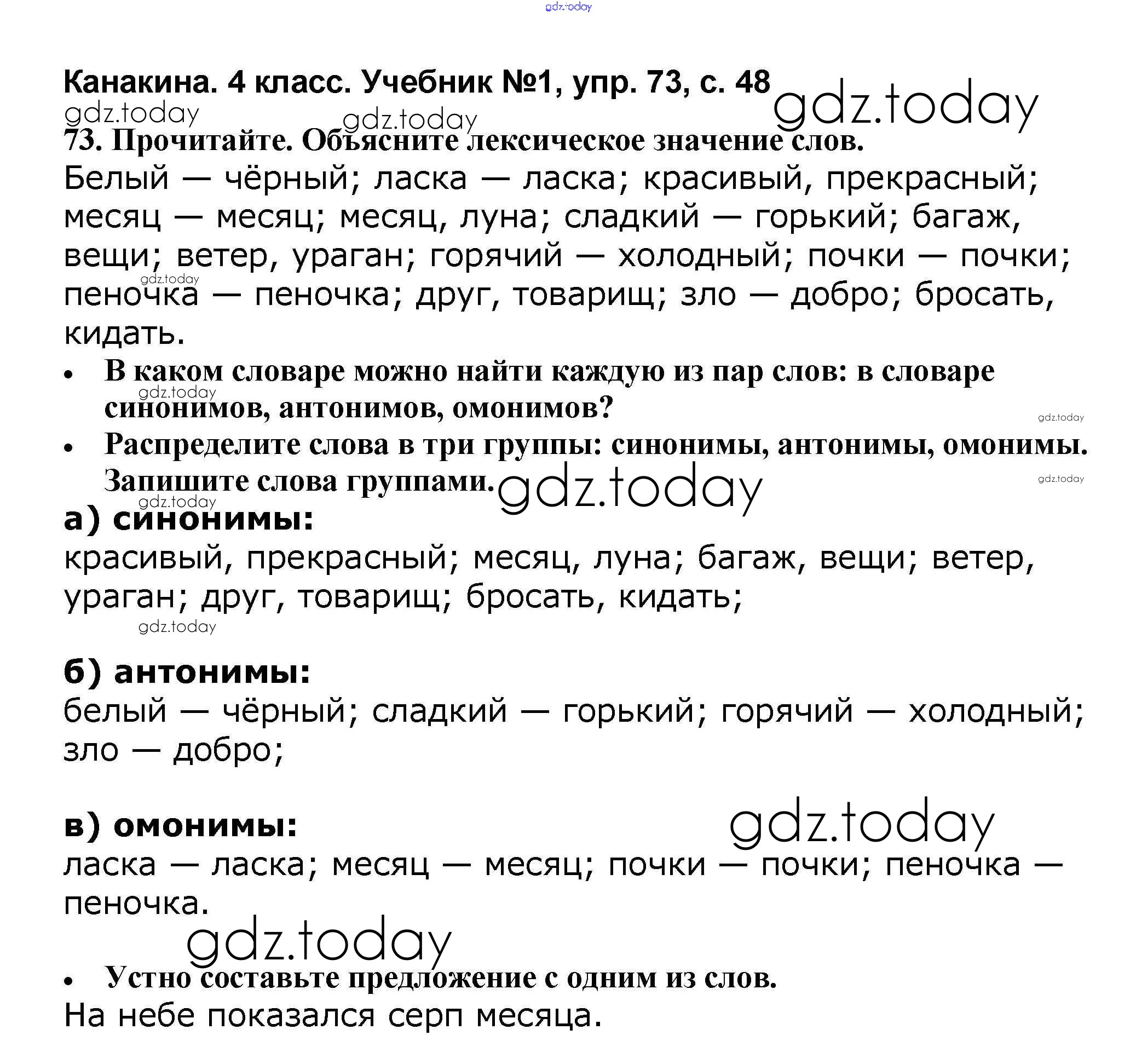 На страницах сайта gdz.today вы найдете учебный и вспомогательный материал, направленный на улучшения знаний школьной программы. ГДЗ - онлайн мир знаний Решение к части 1 73 Учебнику по Русскому языку для 4 класса Канакина, Горецкий Просвещение Школа России 2015