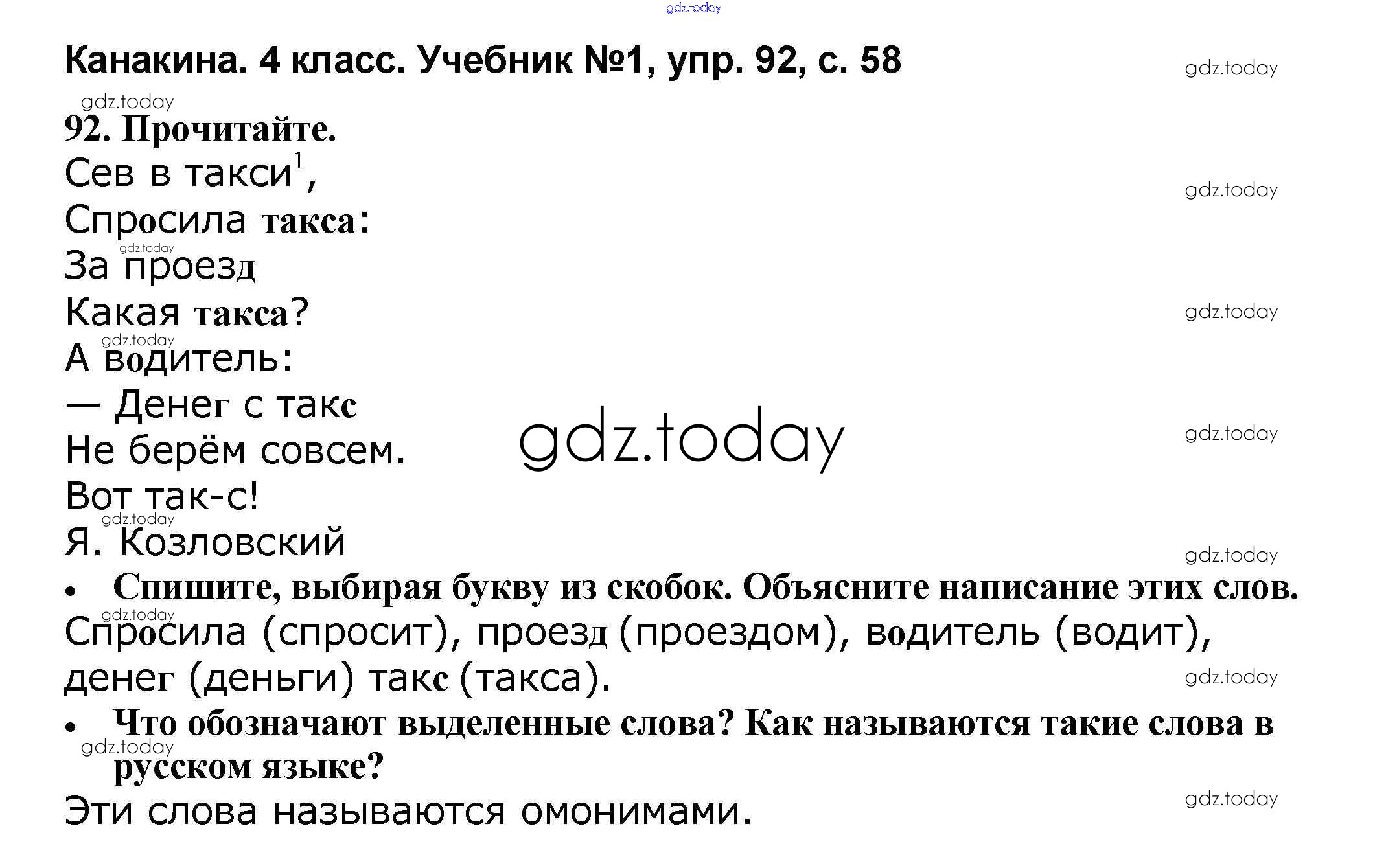 На страницах сайта gdz.today вы найдете учебный и вспомогательный материал, направленный на улучшения знаний школьной программы. ГДЗ - онлайн мир знаний Решение к части 1 92 Учебнику по Русскому языку для 4 класса Канакина, Горецкий Просвещение Школа России 2015