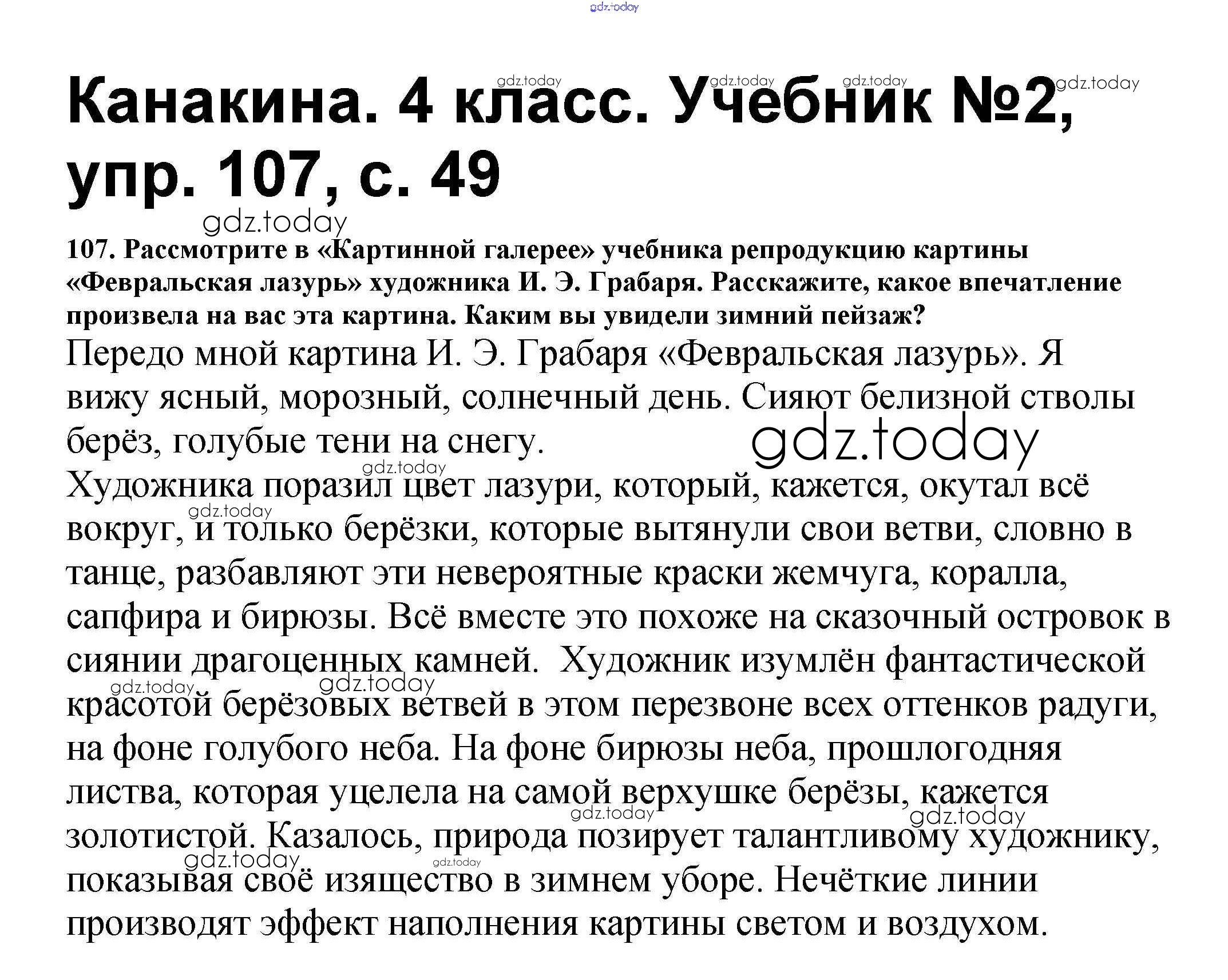 На страницах сайта gdz.today вы найдете учебный и вспомогательный материал, направленный на улучшения знаний школьной программы. ГДЗ - онлайн мир знаний Решение к части 2 107 Учебнику по Русскому языку для 4 класса Канакина, Горецкий Просвещение Школа России 2015