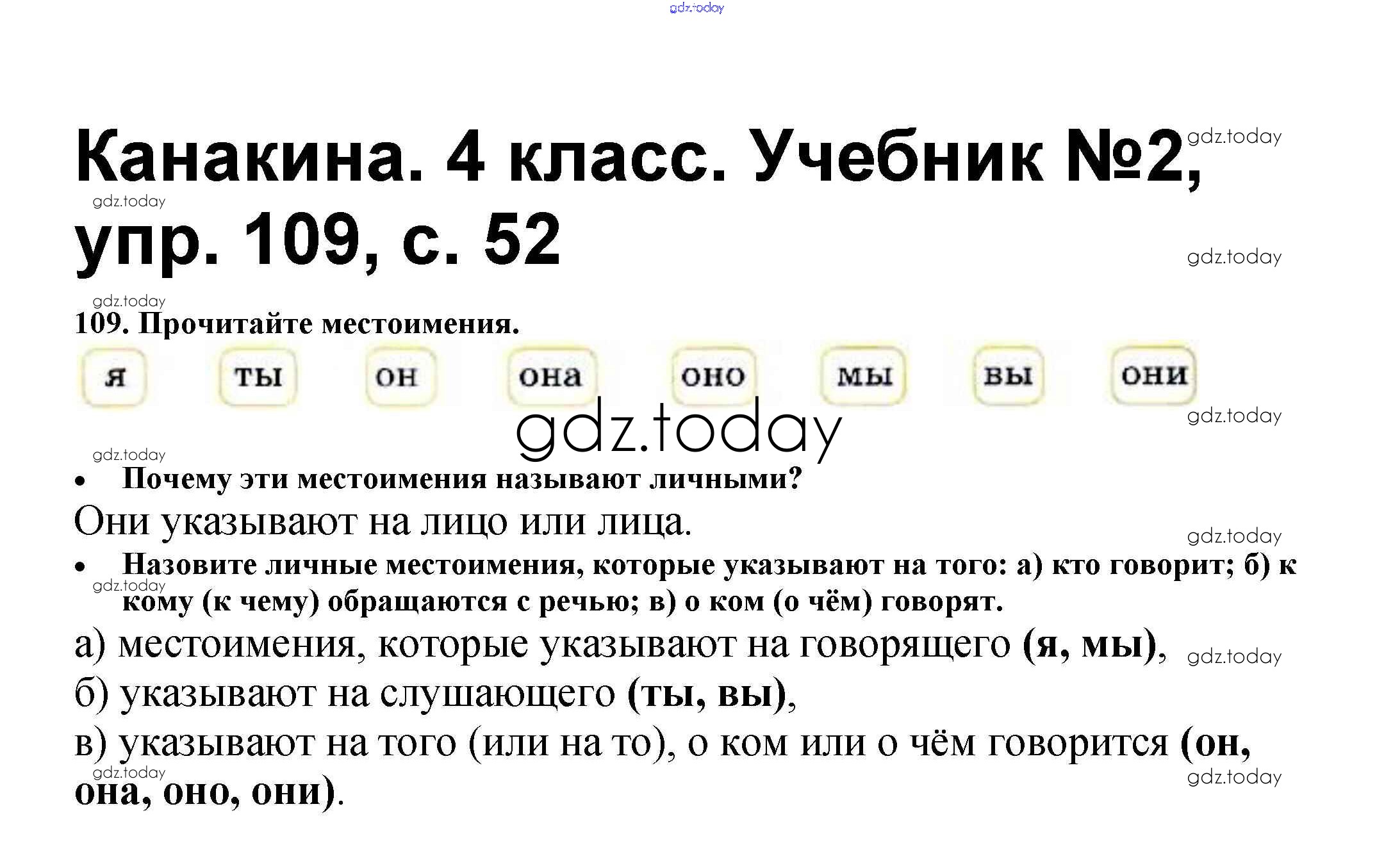 На страницах сайта gdz.today вы найдете учебный и вспомогательный материал, направленный на улучшения знаний школьной программы. ГДЗ - онлайн мир знаний Решение к части 2 109 Учебнику по Русскому языку для 4 класса Канакина, Горецкий Просвещение Школа России 2015