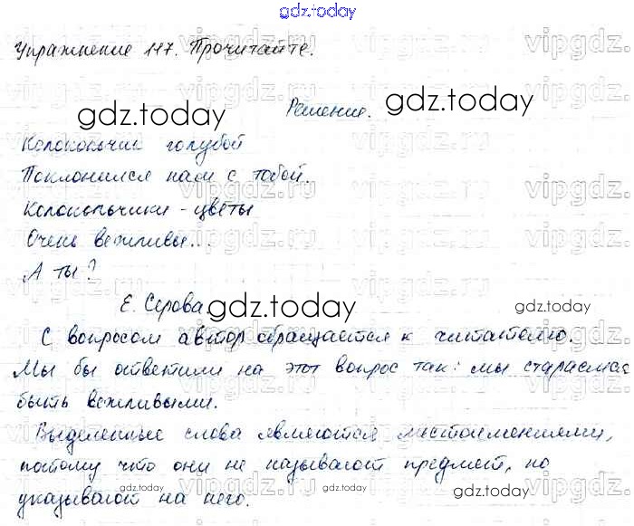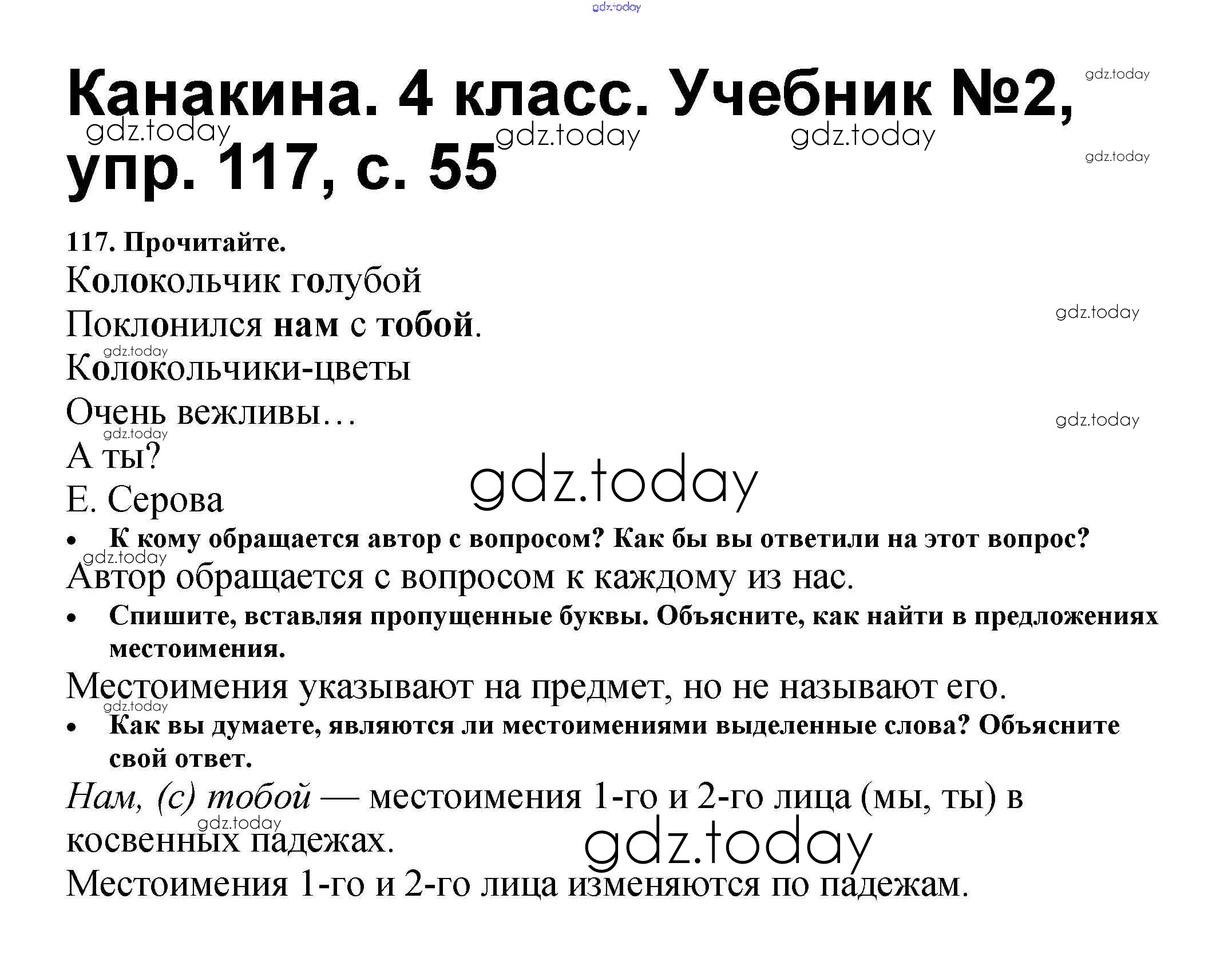 На страницах сайта gdz.today вы найдете учебный и вспомогательный материал, направленный на улучшения знаний школьной программы. ГДЗ - онлайн мир знаний Решение к части 2 117 Учебнику по Русскому языку для 4 класса Канакина, Горецкий Просвещение Школа России 2015