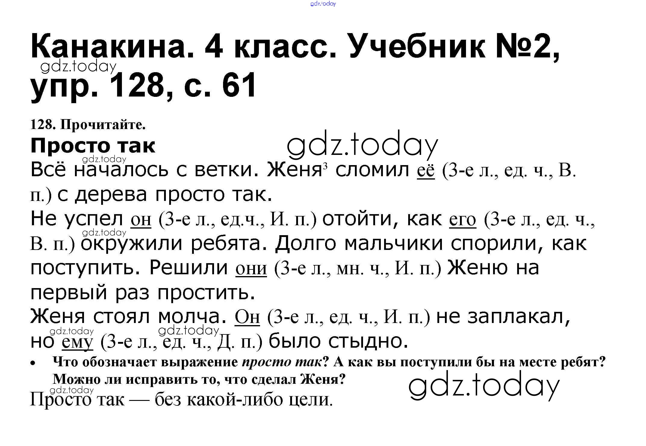 На страницах сайта gdz.today вы найдете учебный и вспомогательный материал, направленный на улучшения знаний школьной программы. ГДЗ - онлайн мир знаний Решение к части 2 128 Учебнику по Русскому языку для 4 класса Канакина, Горецкий Просвещение Школа России 2015