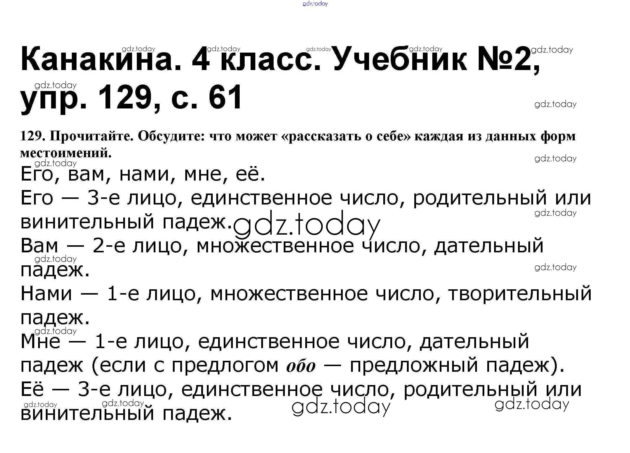 На страницах сайта gdz.today вы найдете учебный и вспомогательный материал, направленный на улучшения знаний школьной программы. ГДЗ - онлайн мир знаний Решение к части 2 129 Учебнику по Русскому языку для 4 класса Канакина, Горецкий Просвещение Школа России 2015