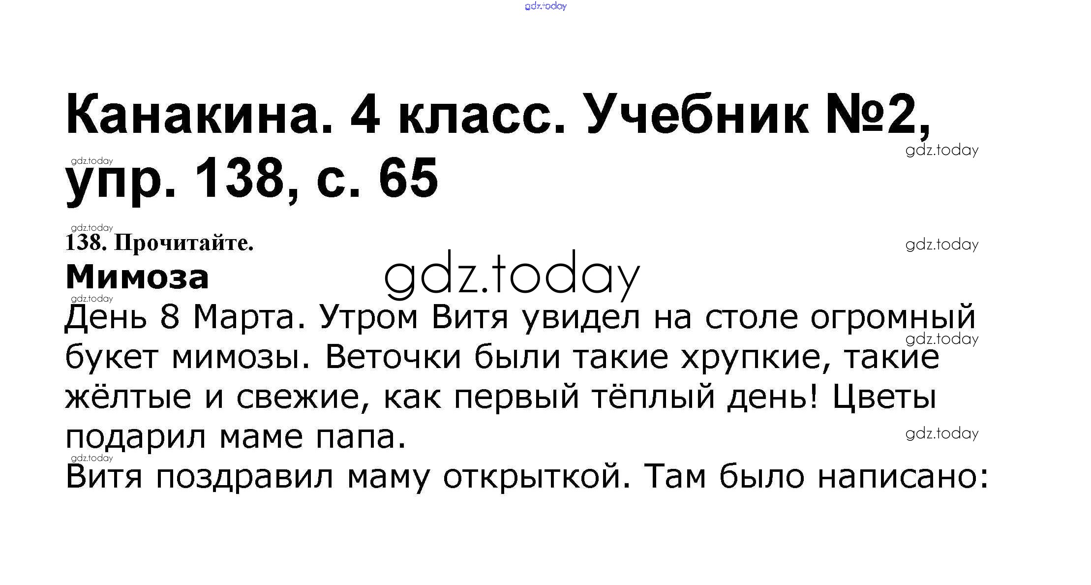 На страницах сайта gdz.today вы найдете учебный и вспомогательный материал, направленный на улучшения знаний школьной программы. ГДЗ - онлайн мир знаний Решение к части 2 138 Учебнику по Русскому языку для 4 класса Канакина, Горецкий Просвещение Школа России 2015