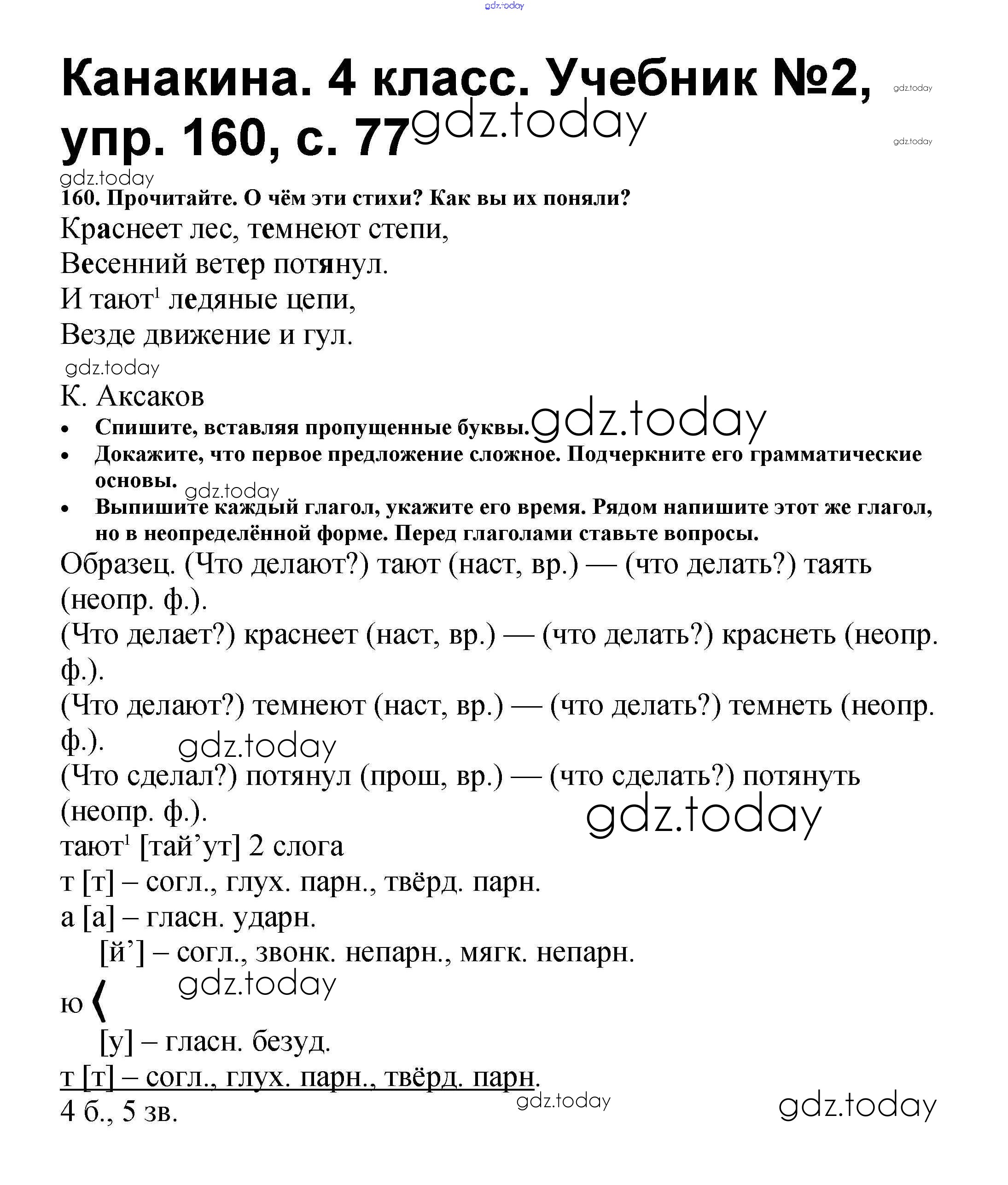 На страницах сайта gdz.today вы найдете учебный и вспомогательный материал, направленный на улучшения знаний школьной программы. ГДЗ - онлайн мир знаний Решение к части 2 160 Учебнику по Русскому языку для 4 класса Канакина, Горецкий Просвещение Школа России 2015