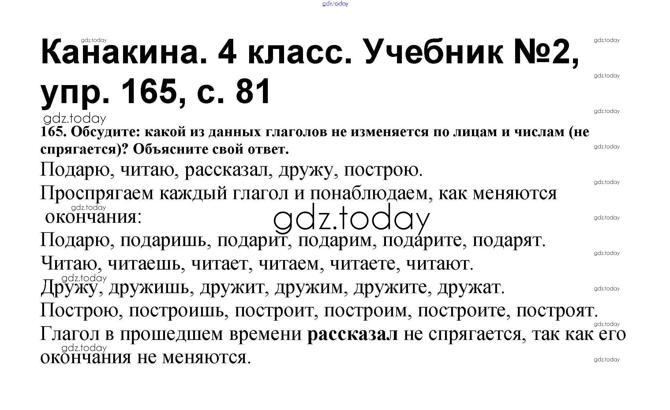 На страницах сайта gdz.today вы найдете учебный и вспомогательный материал, направленный на улучшения знаний школьной программы. ГДЗ - онлайн мир знаний Решение к части 2 165 Учебнику по Русскому языку для 4 класса Канакина, Горецкий Просвещение Школа России 2015