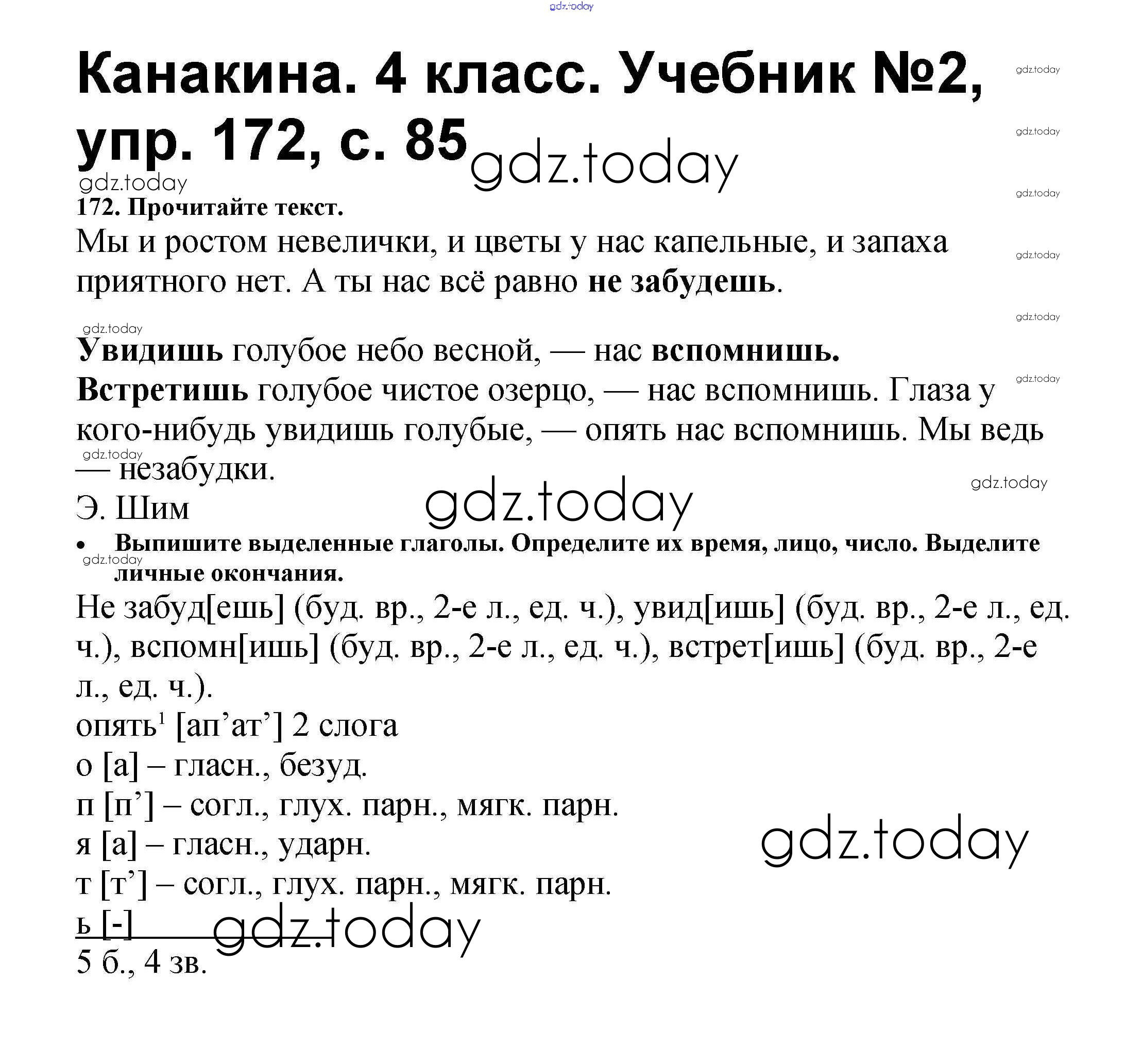 На страницах сайта gdz.today вы найдете учебный и вспомогательный материал, направленный на улучшения знаний школьной программы. ГДЗ - онлайн мир знаний Решение к части 2 172 Учебнику по Русскому языку для 4 класса Канакина, Горецкий Просвещение Школа России 2015