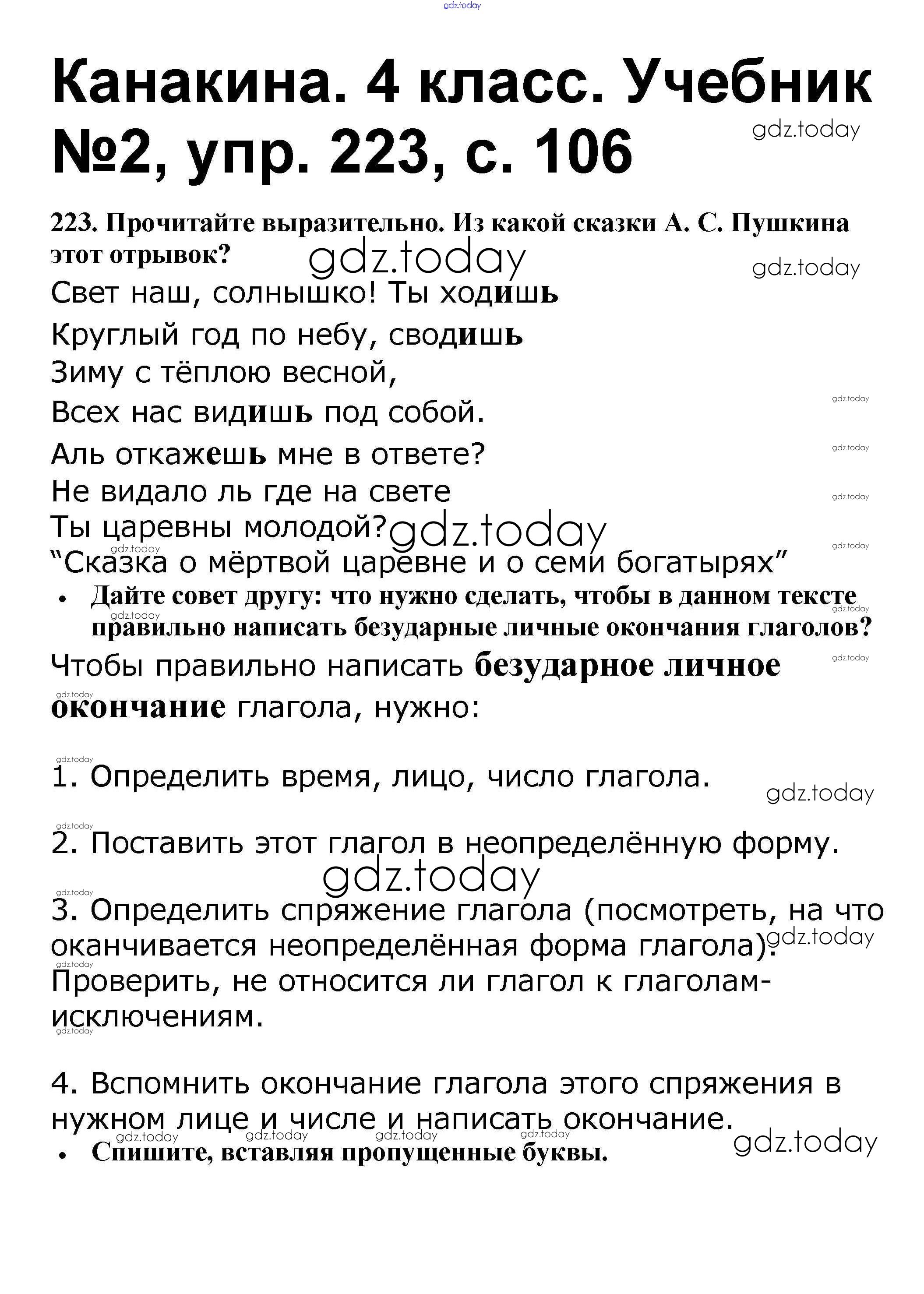 На страницах сайта gdz.today вы найдете учебный и вспомогательный материал, направленный на улучшения знаний школьной программы. ГДЗ - онлайн мир знаний Решение к части 2 223 Учебнику по Русскому языку для 4 класса Канакина, Горецкий Просвещение Школа России 2015