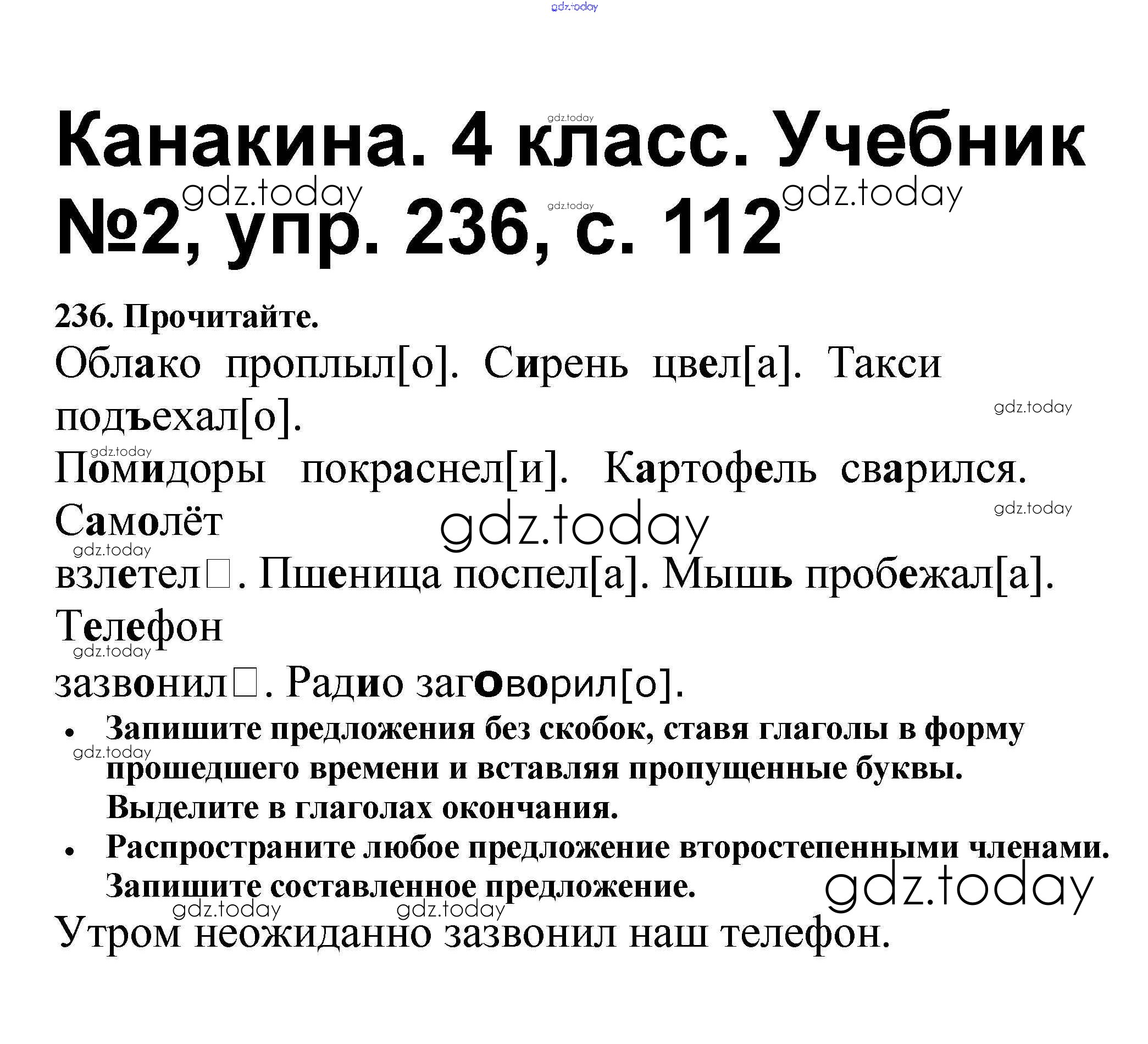 На страницах сайта gdz.today вы найдете учебный и вспомогательный материал, направленный на улучшения знаний школьной программы. ГДЗ - онлайн мир знаний Решение к части 2 236 Учебнику по Русскому языку для 4 класса Канакина, Горецкий Просвещение Школа России 2015