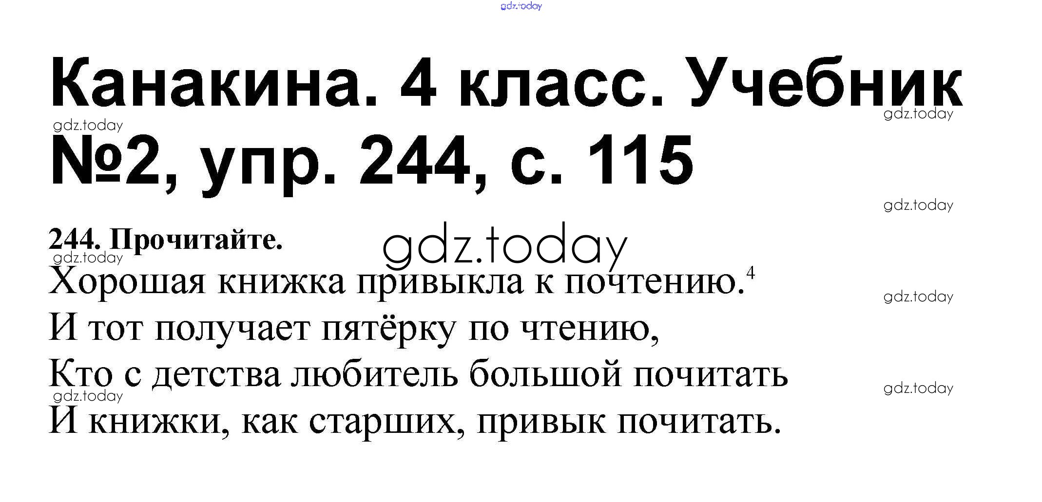 На страницах сайта gdz.today вы найдете учебный и вспомогательный материал, направленный на улучшения знаний школьной программы. ГДЗ - онлайн мир знаний Решение к части 2 244 Учебнику по Русскому языку для 4 класса Канакина, Горецкий Просвещение Школа России 2015