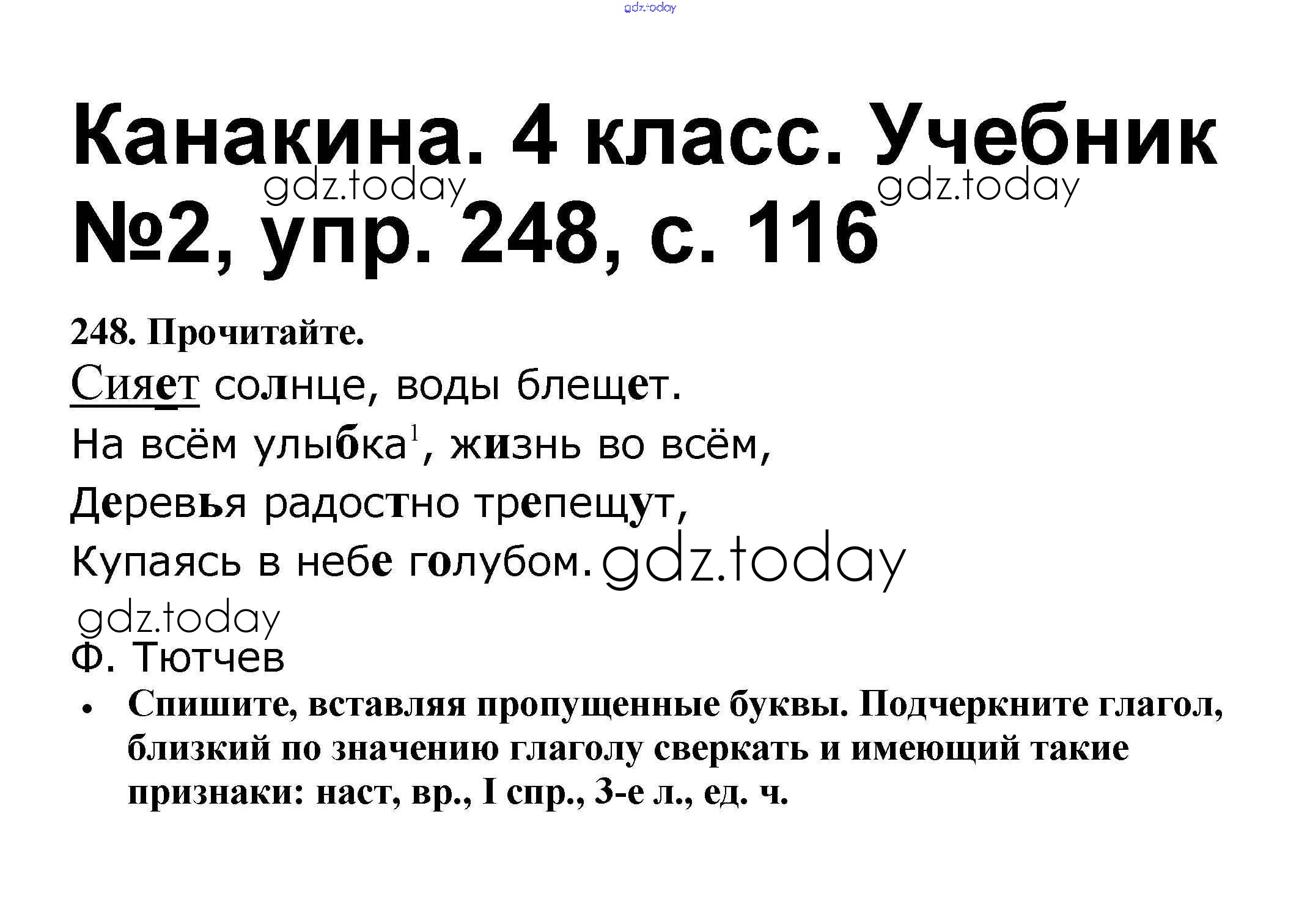 На страницах сайта gdz.today вы найдете учебный и вспомогательный материал, направленный на улучшения знаний школьной программы. ГДЗ - онлайн мир знаний Решение к части 2 248 Учебнику по Русскому языку для 4 класса Канакина, Горецкий Просвещение Школа России 2015