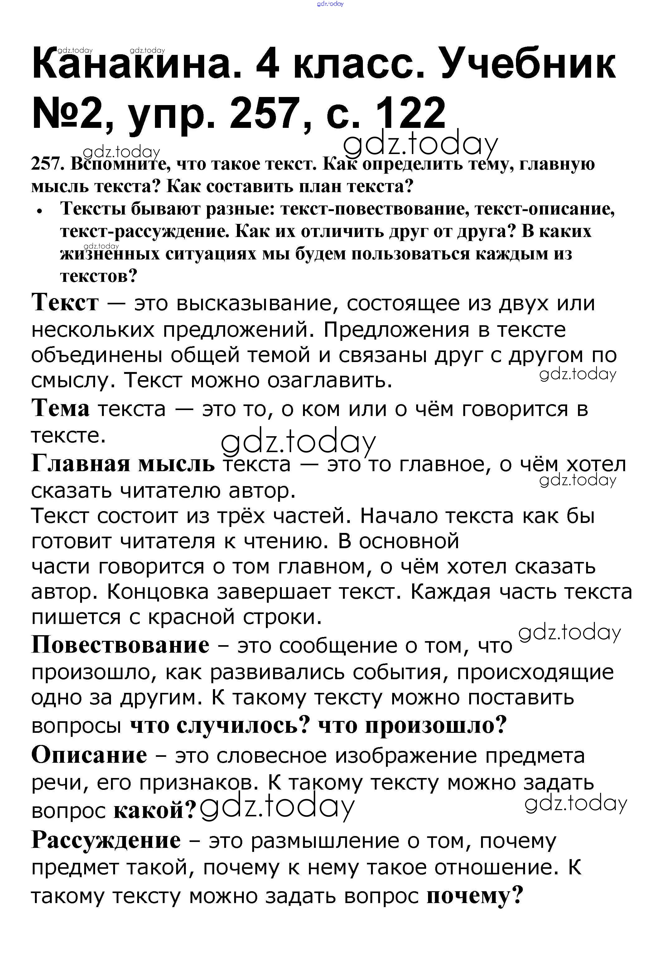 На страницах сайта gdz.today вы найдете учебный и вспомогательный материал, направленный на улучшения знаний школьной программы. ГДЗ - онлайн мир знаний Решение к части 2 257 Учебнику по Русскому языку для 4 класса Канакина, Горецкий Просвещение Школа России 2015