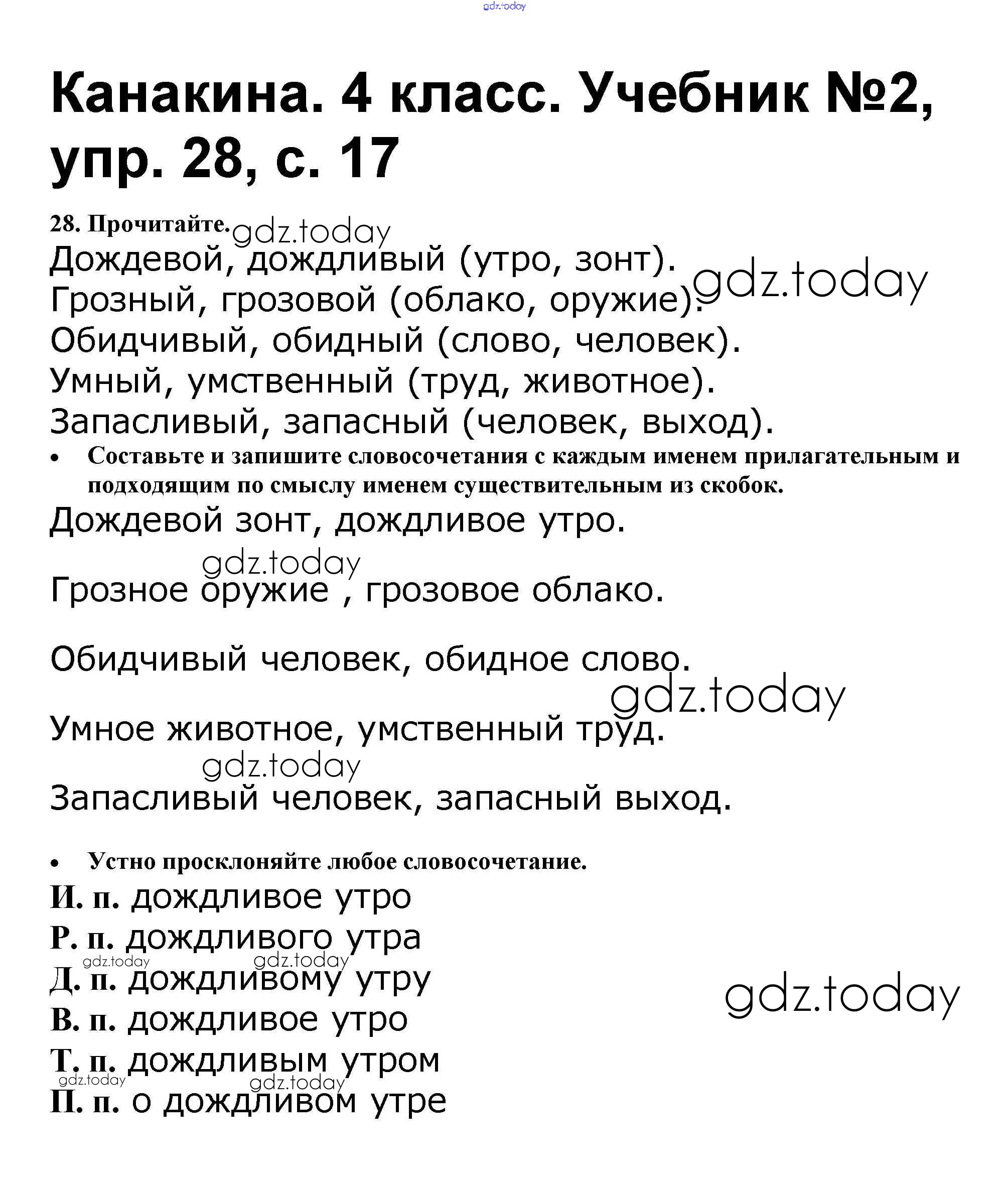 На страницах сайта gdz.today вы найдете учебный и вспомогательный материал, направленный на улучшения знаний школьной программы. ГДЗ - онлайн мир знаний Решение к части 2 28 Учебнику по Русскому языку для 4 класса Канакина, Горецкий Просвещение Школа России 2015