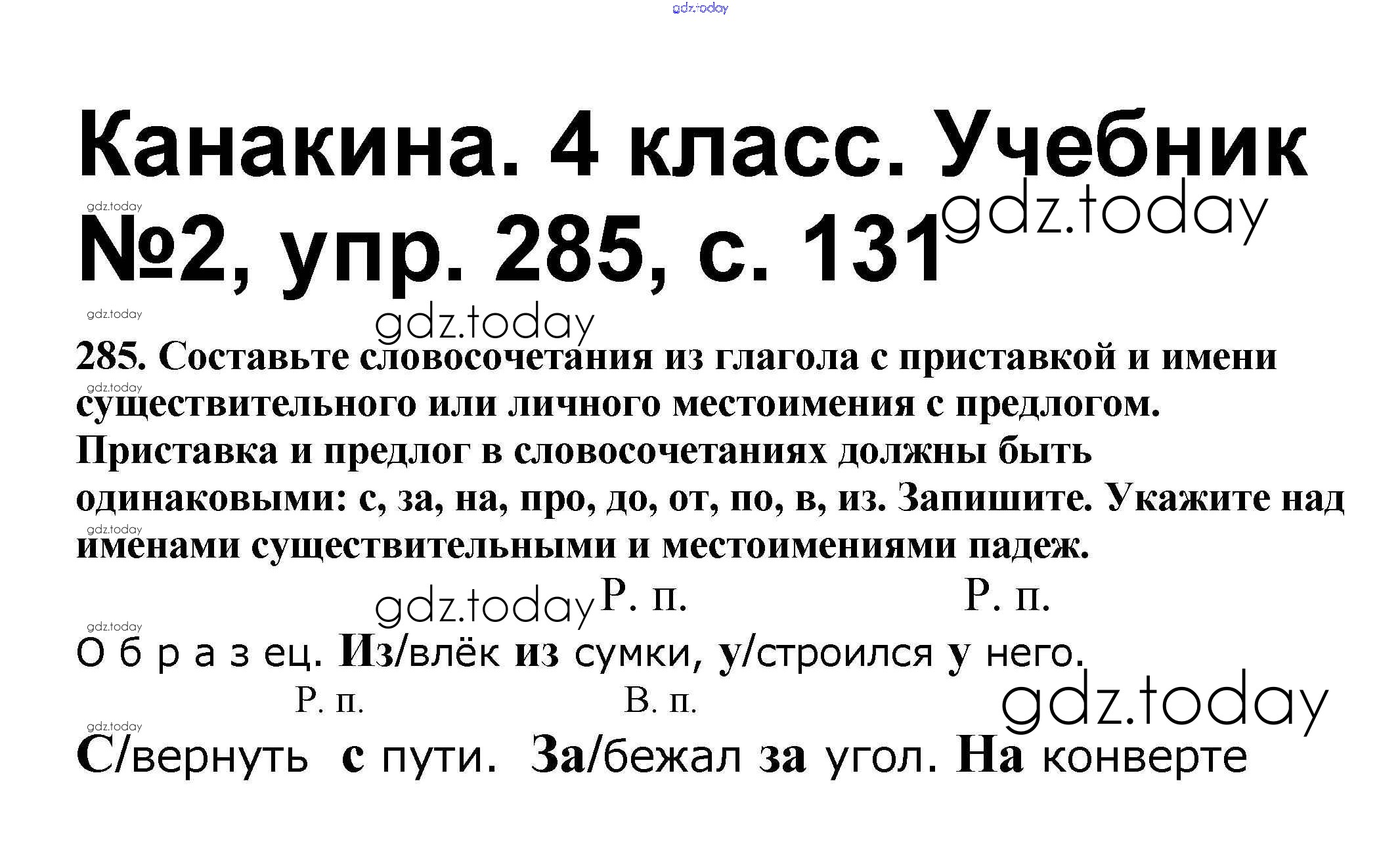 На страницах сайта gdz.today вы найдете учебный и вспомогательный материал, направленный на улучшения знаний школьной программы. ГДЗ - онлайн мир знаний Решение к части 2 285 Учебнику по Русскому языку для 4 класса Канакина, Горецкий Просвещение Школа России 2015