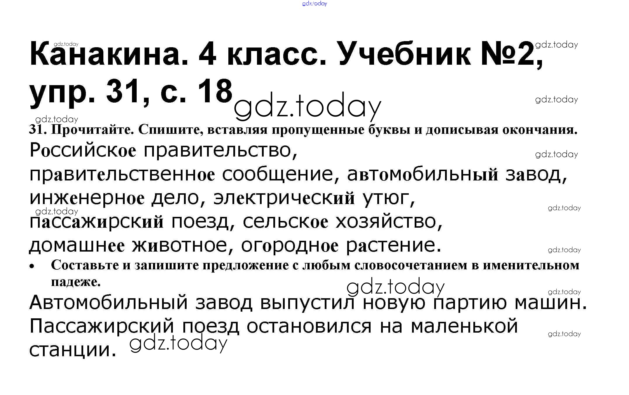 На страницах сайта gdz.today вы найдете учебный и вспомогательный материал, направленный на улучшения знаний школьной программы. ГДЗ - онлайн мир знаний Решение к части 2 31 Учебнику по Русскому языку для 4 класса Канакина, Горецкий Просвещение Школа России 2015