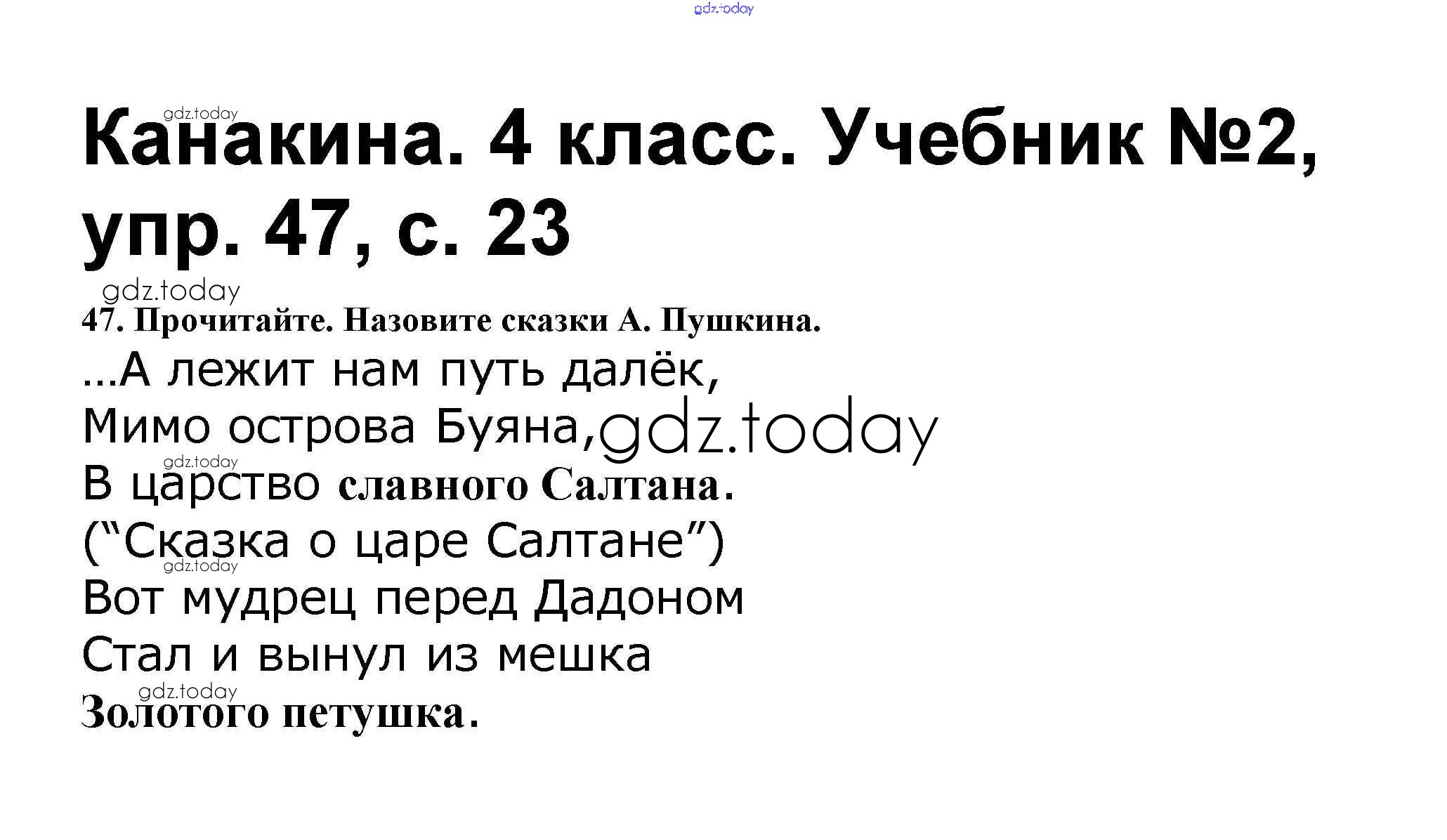 На страницах сайта gdz.today вы найдете учебный и вспомогательный материал, направленный на улучшения знаний школьной программы. ГДЗ - онлайн мир знаний Решение к части 2 47 Учебнику по Русскому языку для 4 класса Канакина, Горецкий Просвещение Школа России 2015