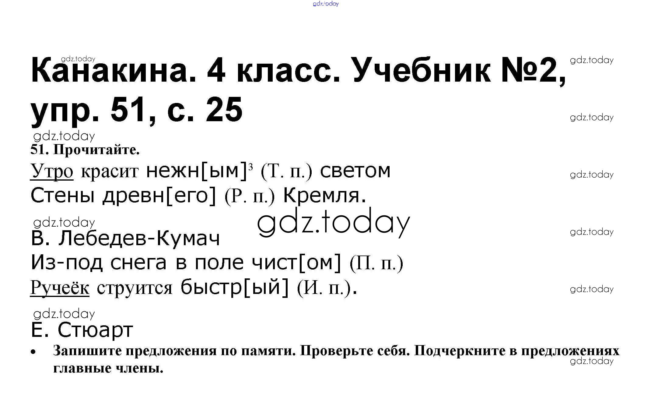 На страницах сайта gdz.today вы найдете учебный и вспомогательный материал, направленный на улучшения знаний школьной программы. ГДЗ - онлайн мир знаний Решение к части 2 51 Учебнику по Русскому языку для 4 класса Канакина, Горецкий Просвещение Школа России 2015