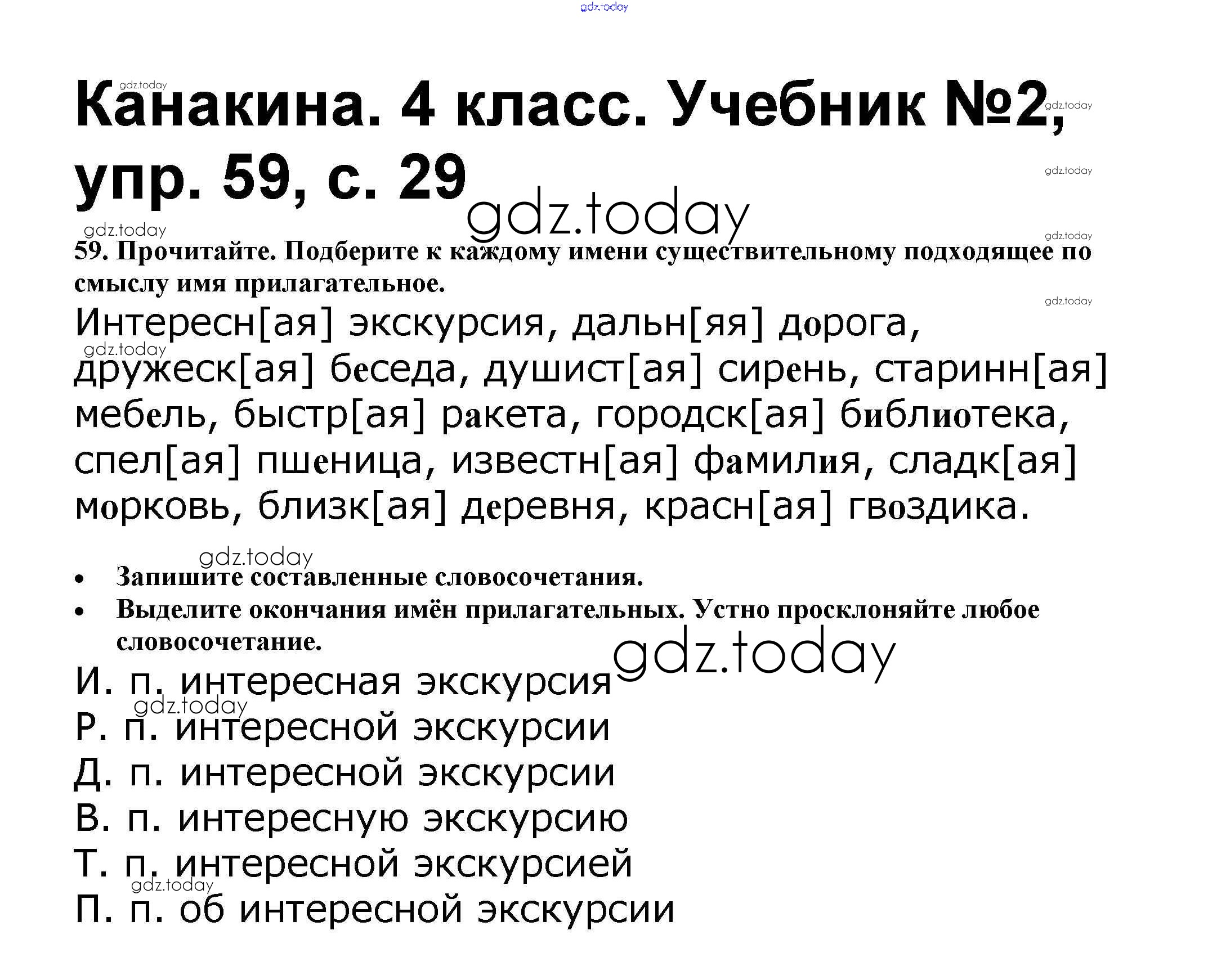 На страницах сайта gdz.today вы найдете учебный и вспомогательный материал, направленный на улучшения знаний школьной программы. ГДЗ - онлайн мир знаний Решение к части 2 59 Учебнику по Русскому языку для 4 класса Канакина, Горецкий Просвещение Школа России 2015