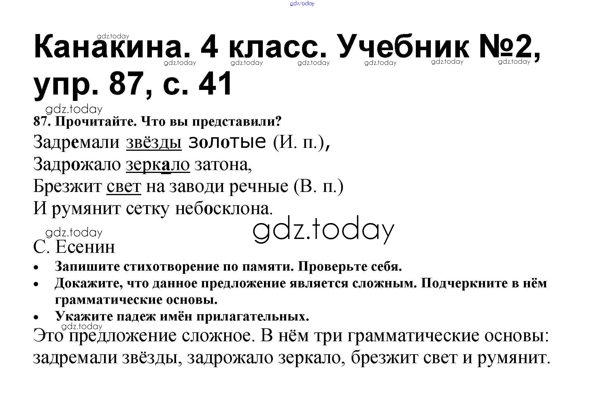 На страницах сайта gdz.today вы найдете учебный и вспомогательный материал, направленный на улучшения знаний школьной программы. ГДЗ - онлайн мир знаний Решение к части 2 87 Учебнику по Русскому языку для 4 класса Канакина, Горецкий Просвещение Школа России 2015