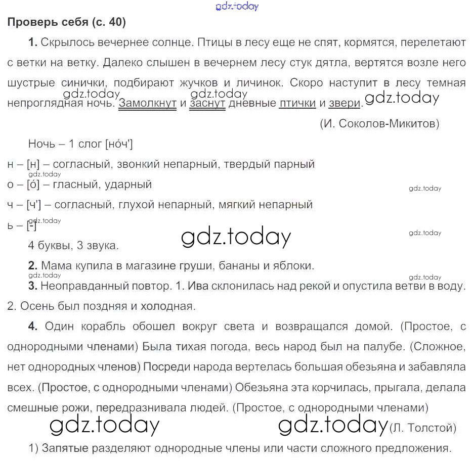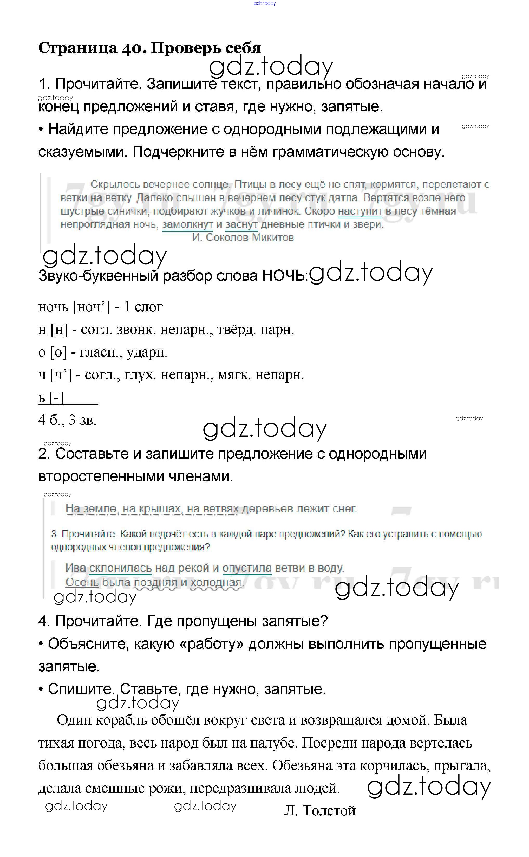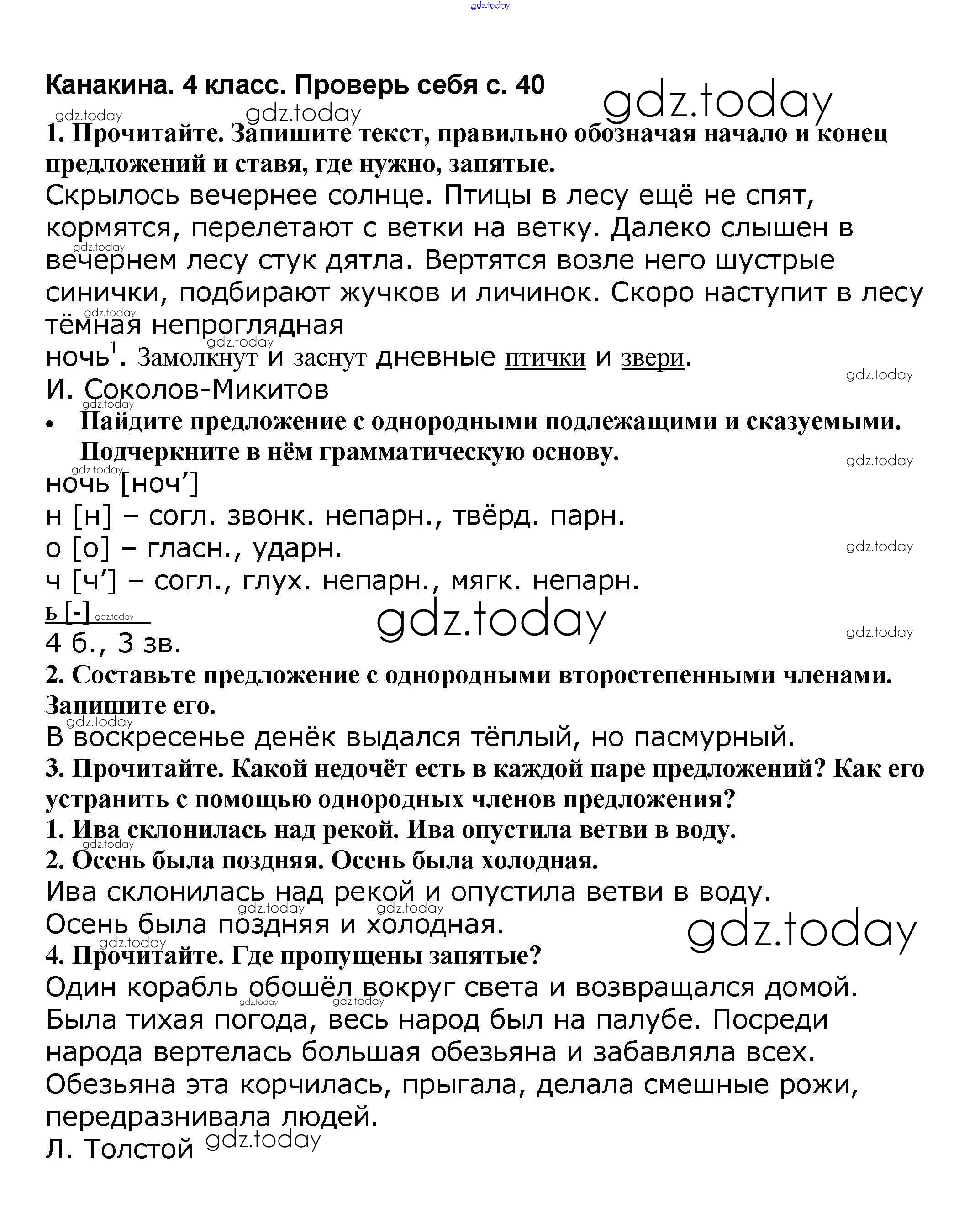 На страницах сайта gdz.today вы найдете учебный и вспомогательный материал, направленный на улучшения знаний школьной программы. ГДЗ - онлайн мир знаний Часть 1. Страницы Решение к проверь себя 40 Учебнику по Русскому языку для 4 класса Канакина, Горецкий Просвещение Школа России 2015