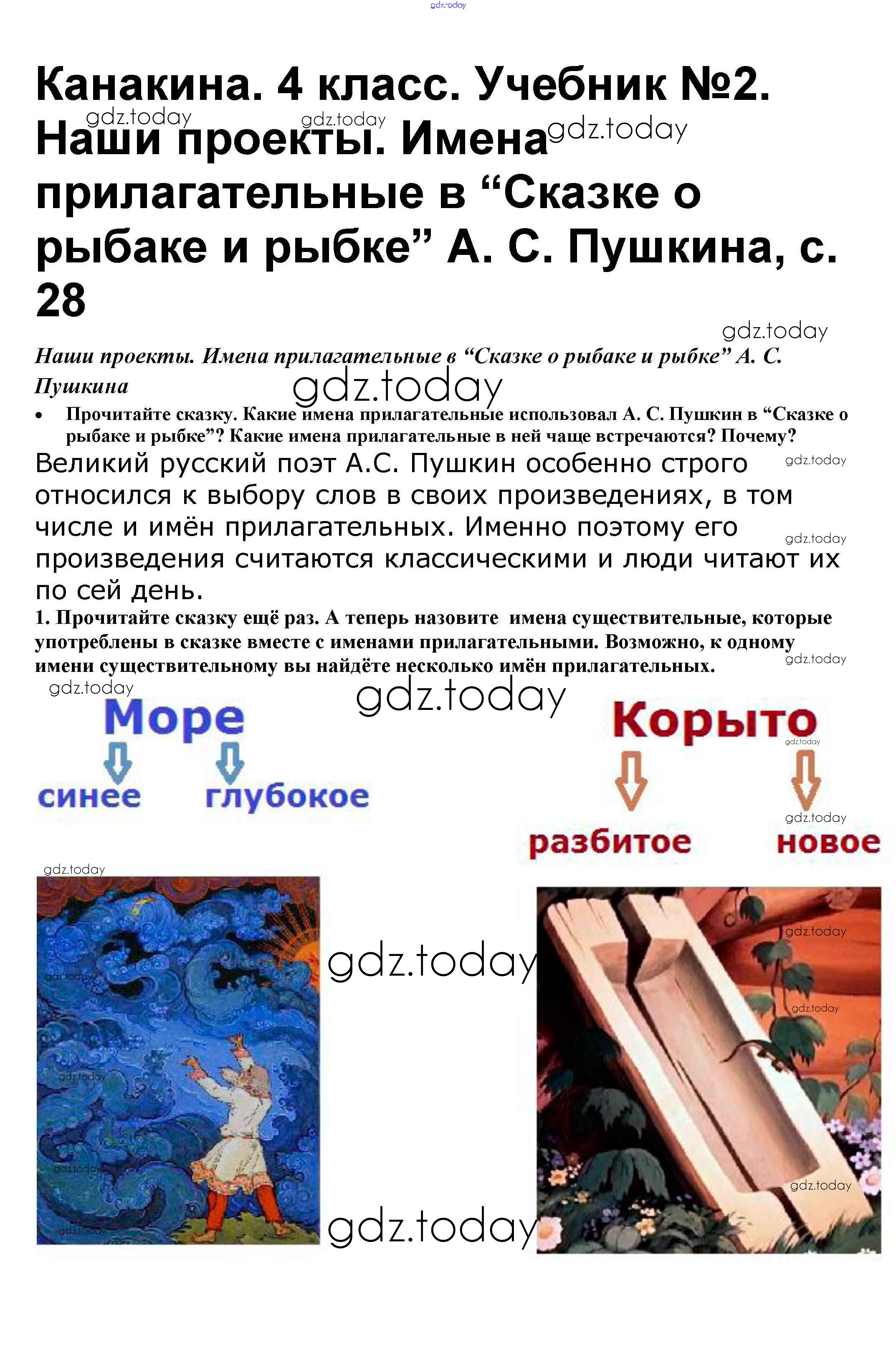 На страницах сайта gdz.today вы найдете учебный и вспомогательный материал, направленный на улучшения знаний школьной программы. ГДЗ - онлайн мир знаний Часть 2 Наши проекты Имена прилагательные в Сказке о рыбаке и рыбке А. С. Пушкина Учебнику по Русскому языку для 4 класса Канакина, Горецкий Просвещение Школа России 2015