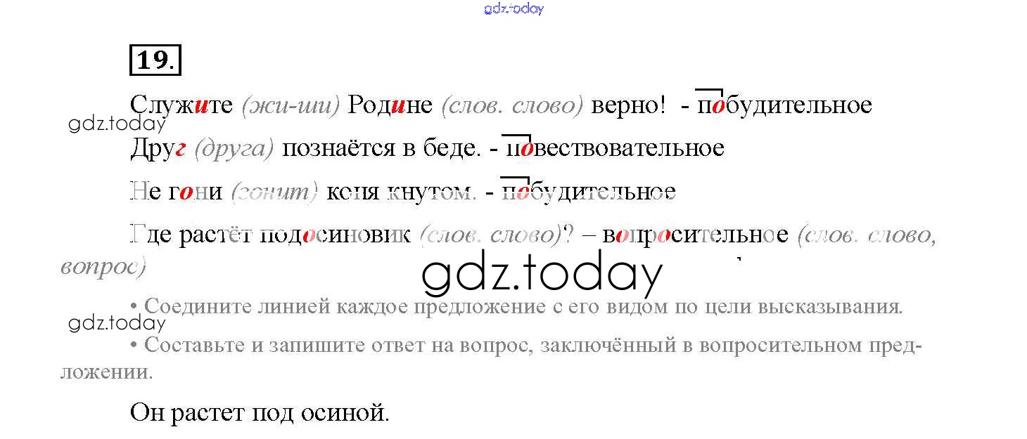 На страницах сайта gdz.today вы найдете учебный и вспомогательный материал, направленный на улучшения знаний школьной программы. ГДЗ - онлайн мир знаний Часть 1. Решение к заданиям 19 Рабочей тетради по Русскому языку для 4 класса Канакина Просвещение Школа России 2013